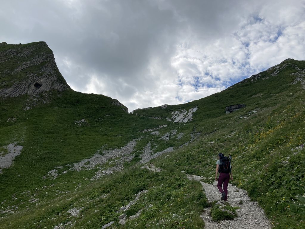 Hinter dem Leiterepass beginnt der abwechslungsreiche Höhenweg unterhalb des Homad durch bis zur Ober-Walalp. Zu Beginn steinig, dann mit massig viel Ziegen-Droppings, unverhofft durch einen begrünten felsigen Abschnitt über eine cheibe stotzige Stelle mit schönen Föhren und Blumen bis hin zu Berghütte mit urchigem Getränkeautomaten und zwei Monster-Hasen. Hier gilt mittendrin statt nur dabei!