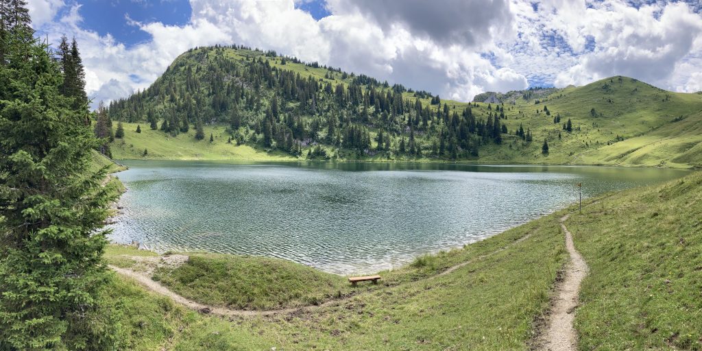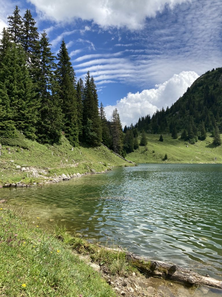 Kurz vor dem letzten Aufstieg zum Stockhorn biegen wir rechts ab und folgen dem Bättelwägli zum Oberstockesee. Nach einer kleinen Tremola runter geht’s auch gleich wieder durch ein verwunschenes karstiges Wäldchen zum See hoch. Erstaunlicherweise begegnen wir auf diesem letzten Abschnitt absolut niemandem, erst am See sind ein paar vereinzelte Seelen. Von ihnen lasse ich mich nicht stören und gönne mir eine Abkühlung. Hoffentlich sind die in den tieferen Wasserschichten lebenden «speziellen anaeroben Bakterien» nicht allzu speziell… 🙂