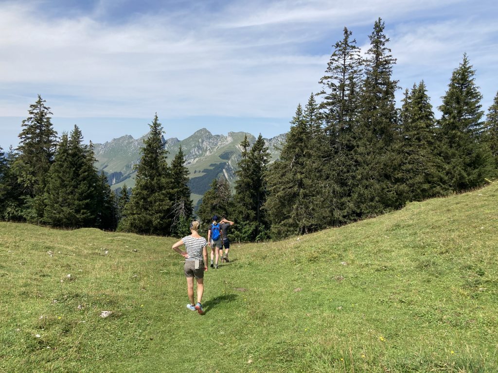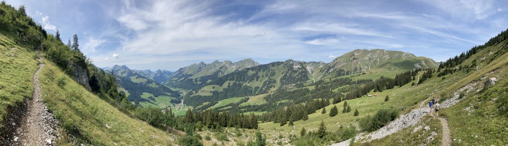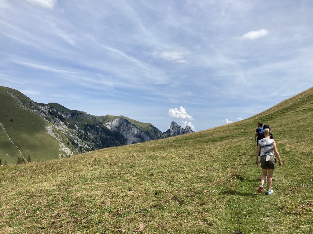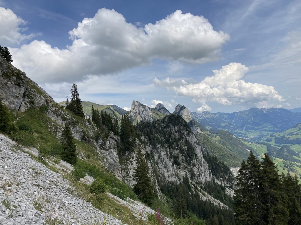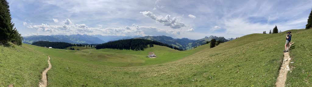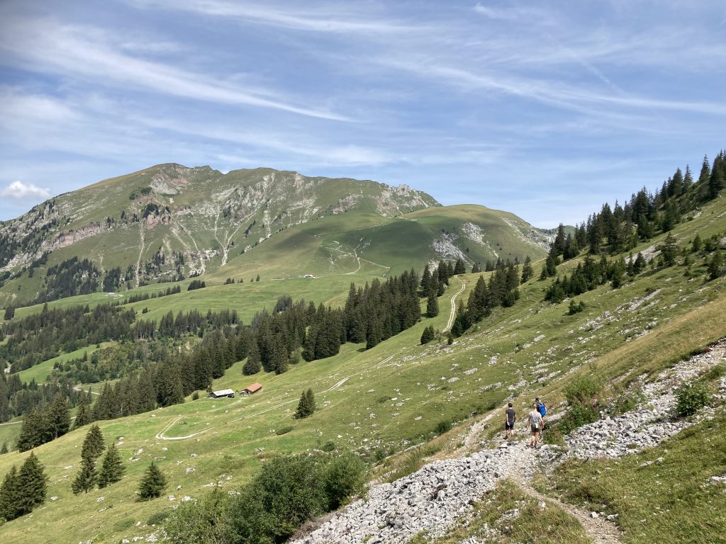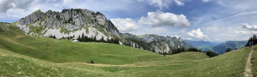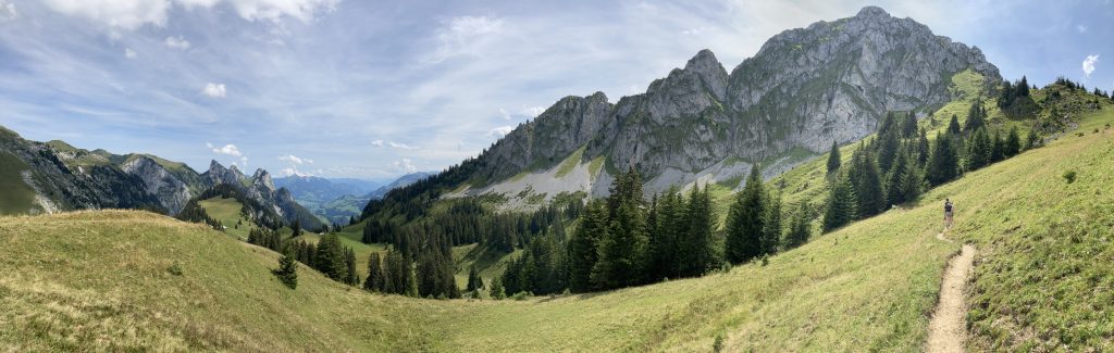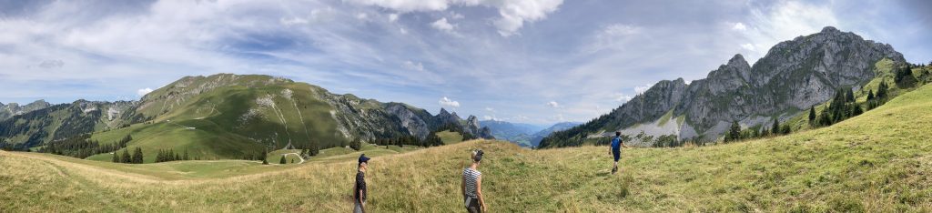 Gleichentags zieht es uns auf dem Jaun am Nachmittag zu einer kleinen Entdeckungstour in die andere Richtung als zum Hundsrügg, nämlich zur Bäderhore. Vor ein paar Jahren hatte ich sie mit Nina und Tochter Amélie von der Westflanke her bestiegen, heute planen wir sie auf dem Rundweg – ja der Name sagt’s – zu umrunden. Alles in allem eine abwechslungsreiche und kurzweilige Wanderung mit ein paar echten Hinguckern. Kleiner Tipp: Wer auf der Alp Grosse Bäder einen Imbiss vor oder nach dem Rundweg einplant, darf mit dem Auto die grösstenteils asphaltierte und nicht gerade spannende Anreise vom Jaun her mit dem Auto vornehmen.
