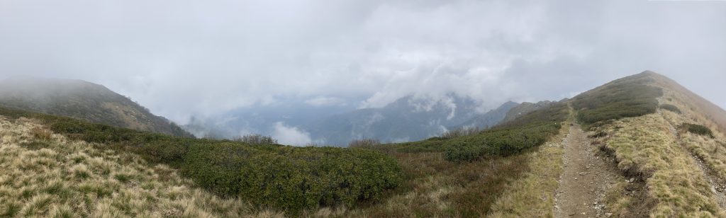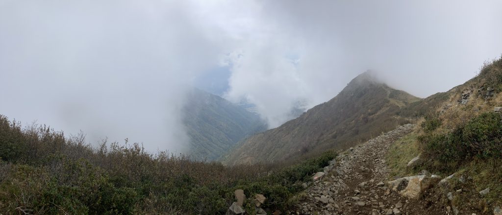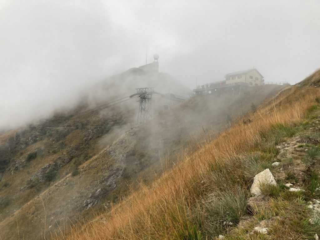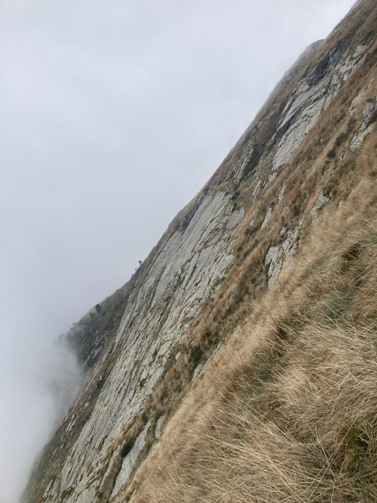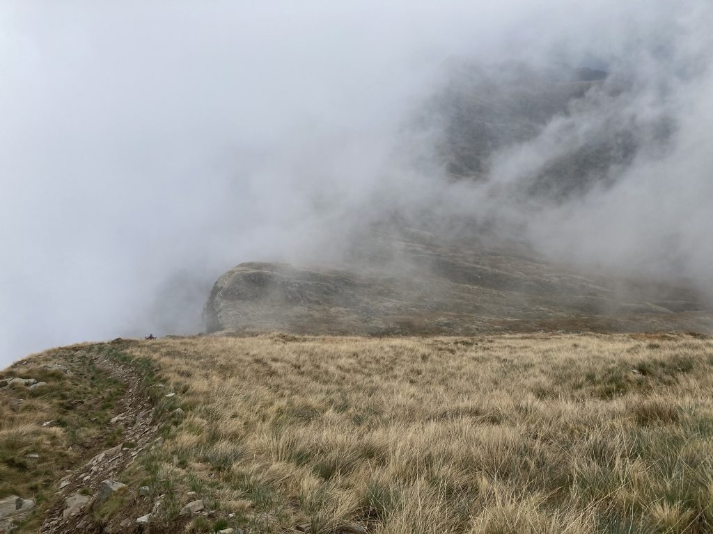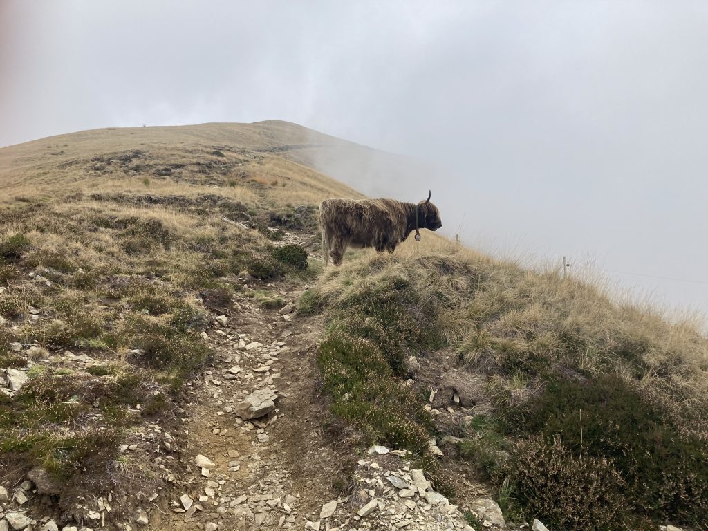 Von da weg beginnt der reizvollste Teil der Gratwanderung, der gar bei quasi null Sicht spektakulär ist. Ich hatte mir erhofft zumindest einen Blick auf die Viertausender zum Westen hin werfen zu können, das wurde nichts, dafür begegnete ich einigen neugierigen Hochlandrindern.