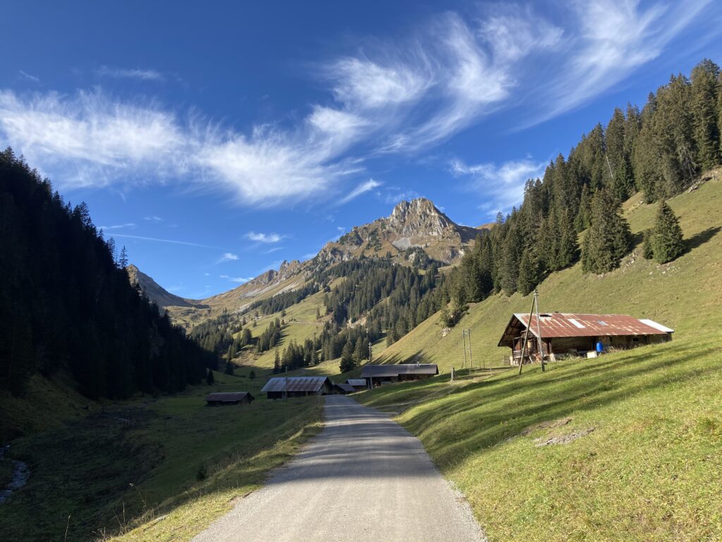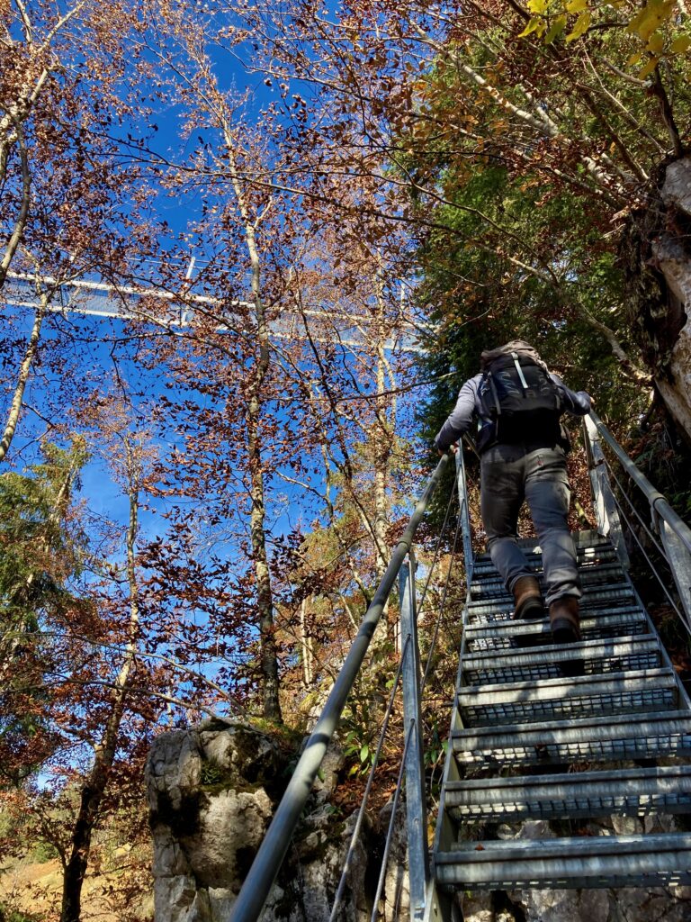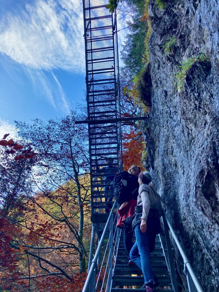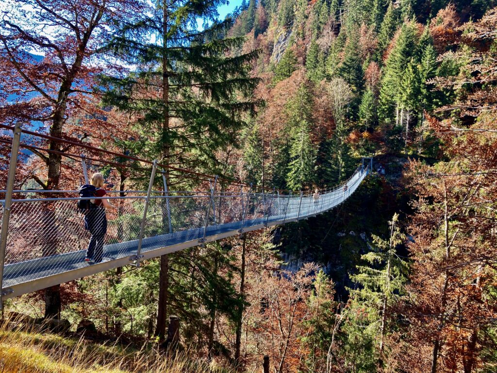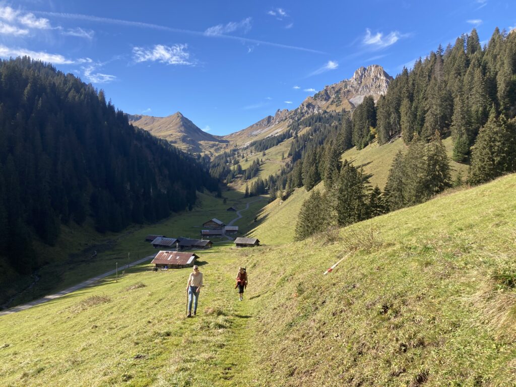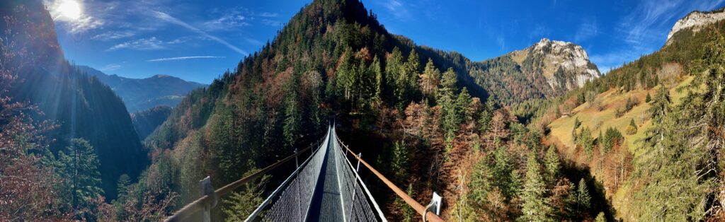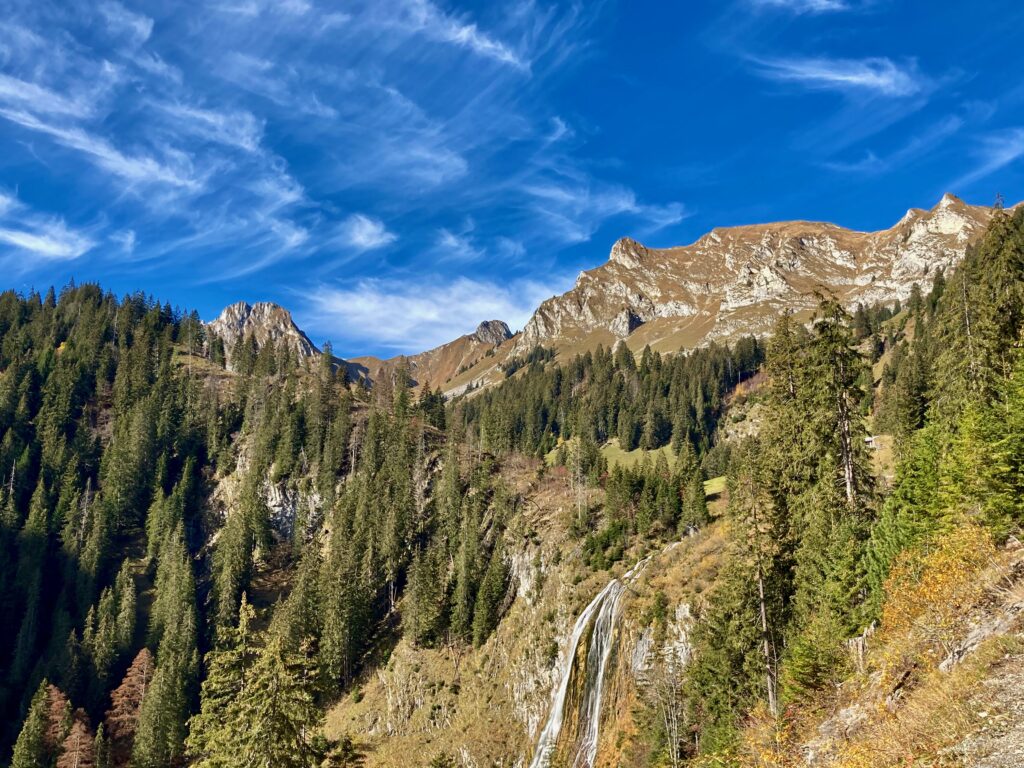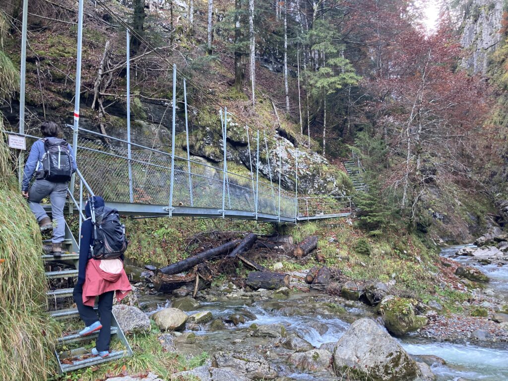 Der letzte Oktobertag hat sich wettertechnisch grandios angekündigt, und so habe ich mich mit Bea, Nina und Ben aufgemacht, in einer teils steilen aber von einer immer schöner werdenden Aussicht gekrönte Wanderung vom Simmental ins Gantrischgebiet zu queren. Der Zug ist rappelvoll mit Wandervolk, alle brav mit Maske, und so starten wir beim schnuckeligen Bahnhof Weissenburg in Richtung Weissenburgbad-Ruine. Gleich dahinter schlängelt sich der Wanderweg dem Buuschebach entlang bevor er steil und mittels eisernen Treppen zur schaukeligen Hängebrücke hochsteigt. Letztere ist ein echtes Highlight und für Schwindelfreie echt den Umweg wert!