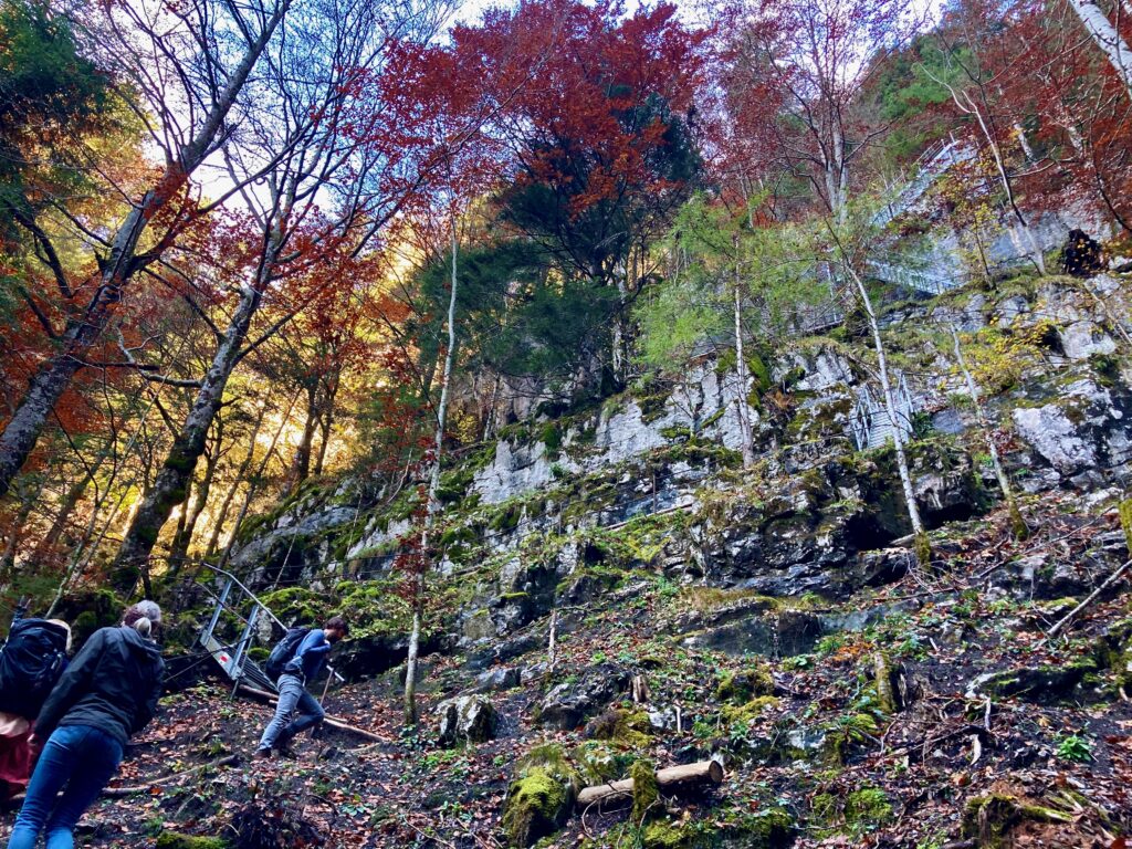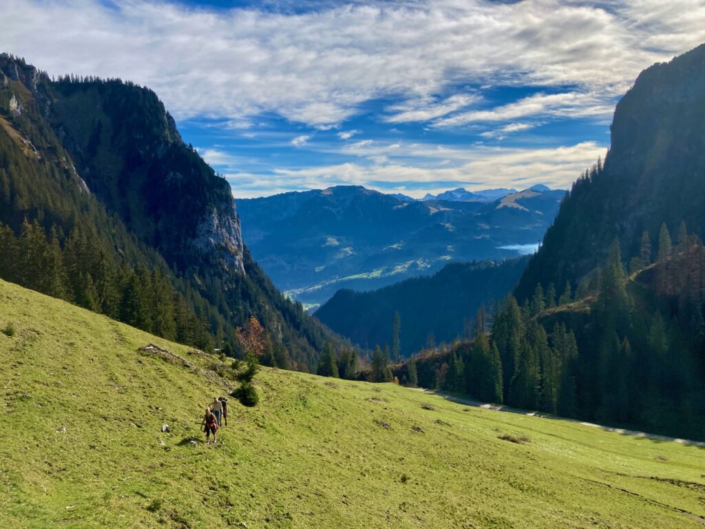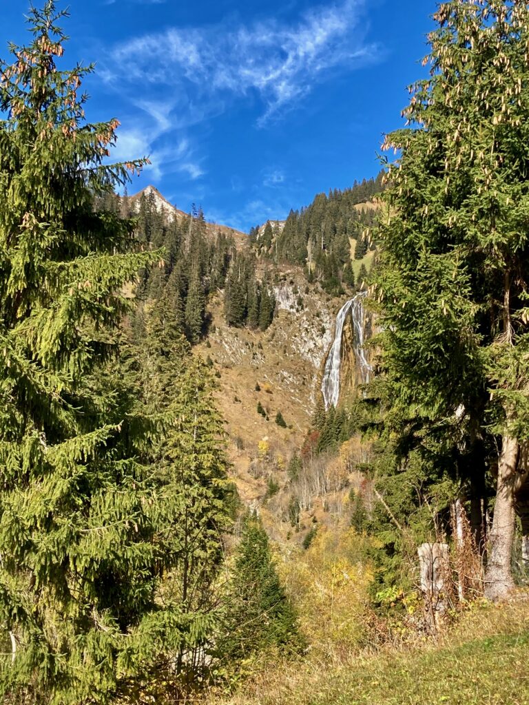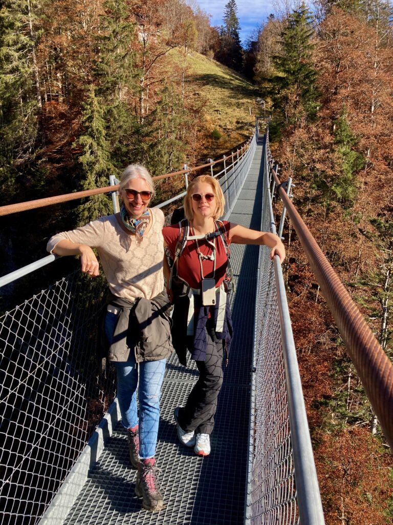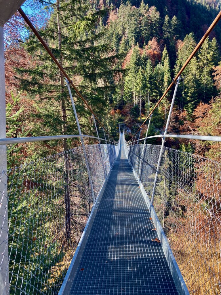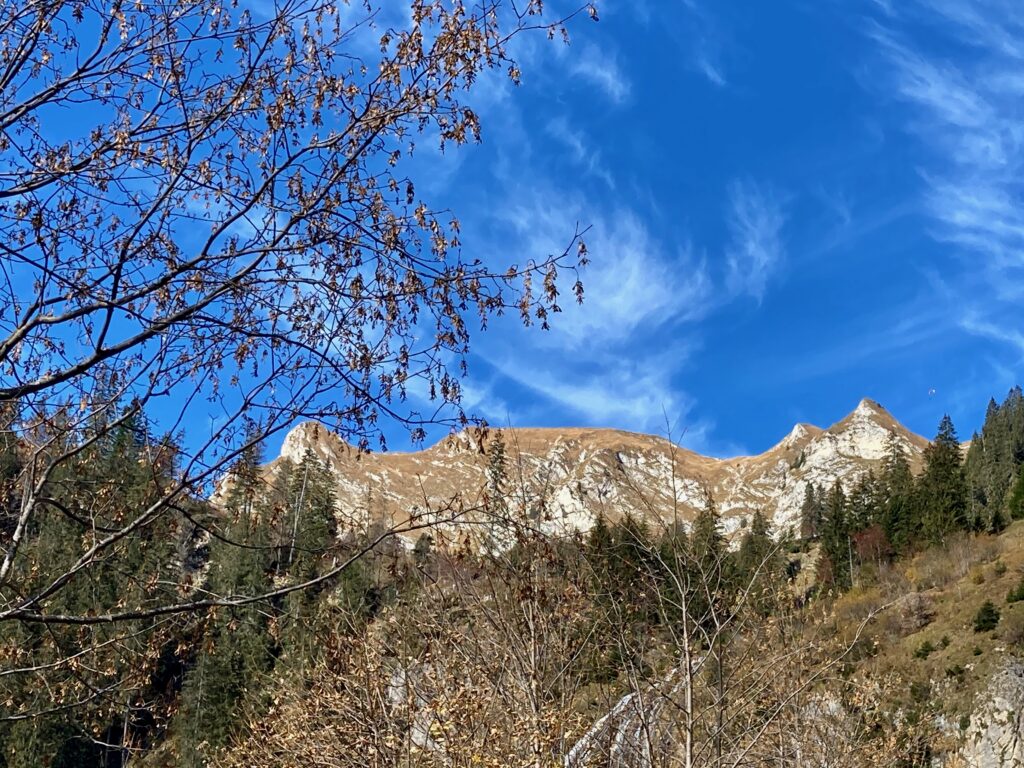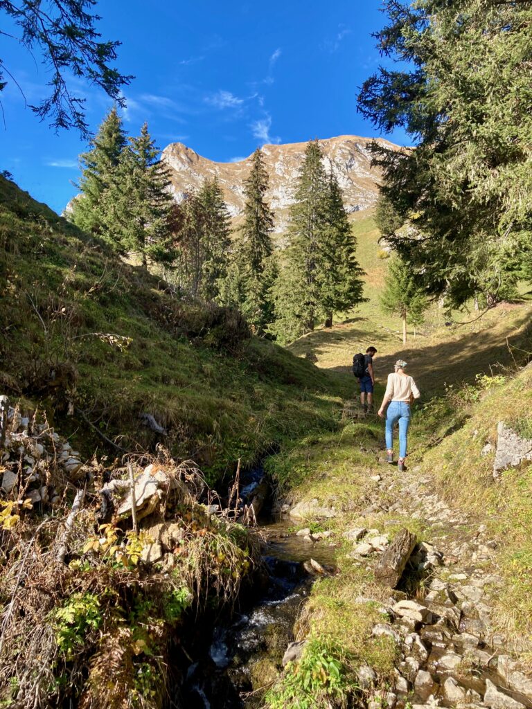 Der letzte Oktobertag hat sich wettertechnisch grandios angekündigt, und so habe ich mich mit Bea, Nina und Ben aufgemacht, in einer teils steilen aber von einer immer schöner werdenden Aussicht gekrönte Wanderung vom Simmental ins Gantrischgebiet zu queren. Der Zug ist rappelvoll mit Wandervolk, alle brav mit Maske, und so starten wir beim schnuckeligen Bahnhof Weissenburg in Richtung Weissenburgbad-Ruine. Gleich dahinter schlängelt sich der Wanderweg dem Buuschebach entlang bevor er steil und mittels eisernen Treppen zur schaukeligen Hängebrücke hochsteigt. Letztere ist ein echtes Highlight und für Schwindelfreie echt den Umweg wert!