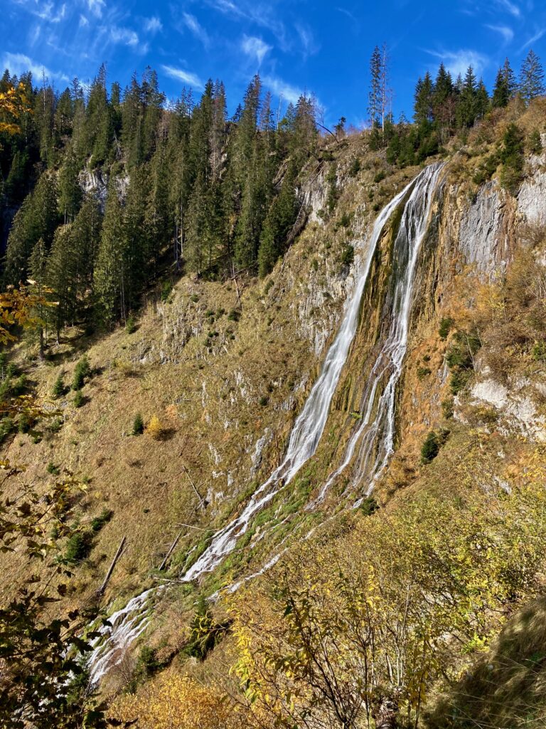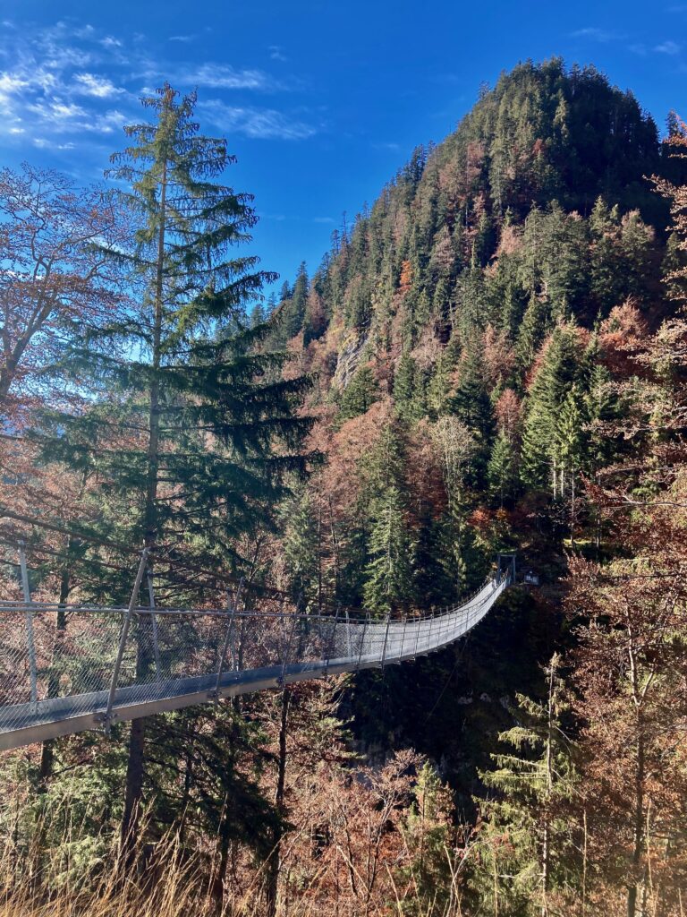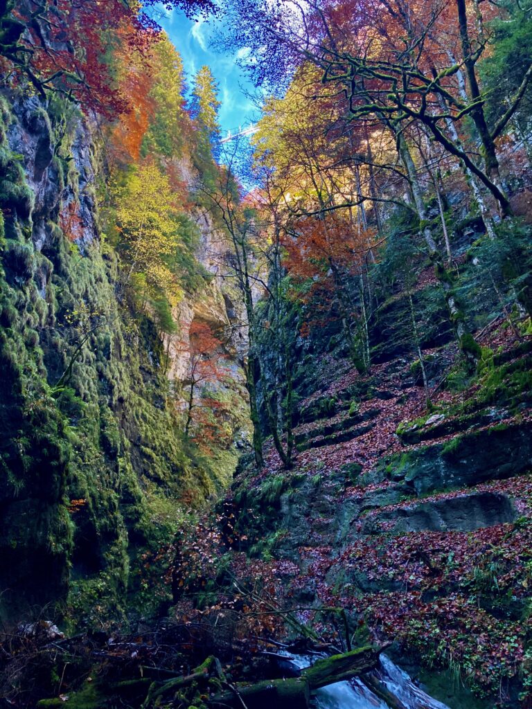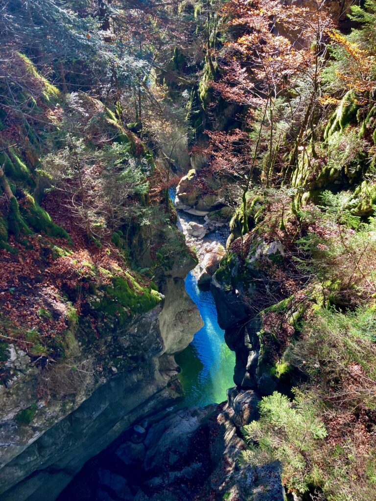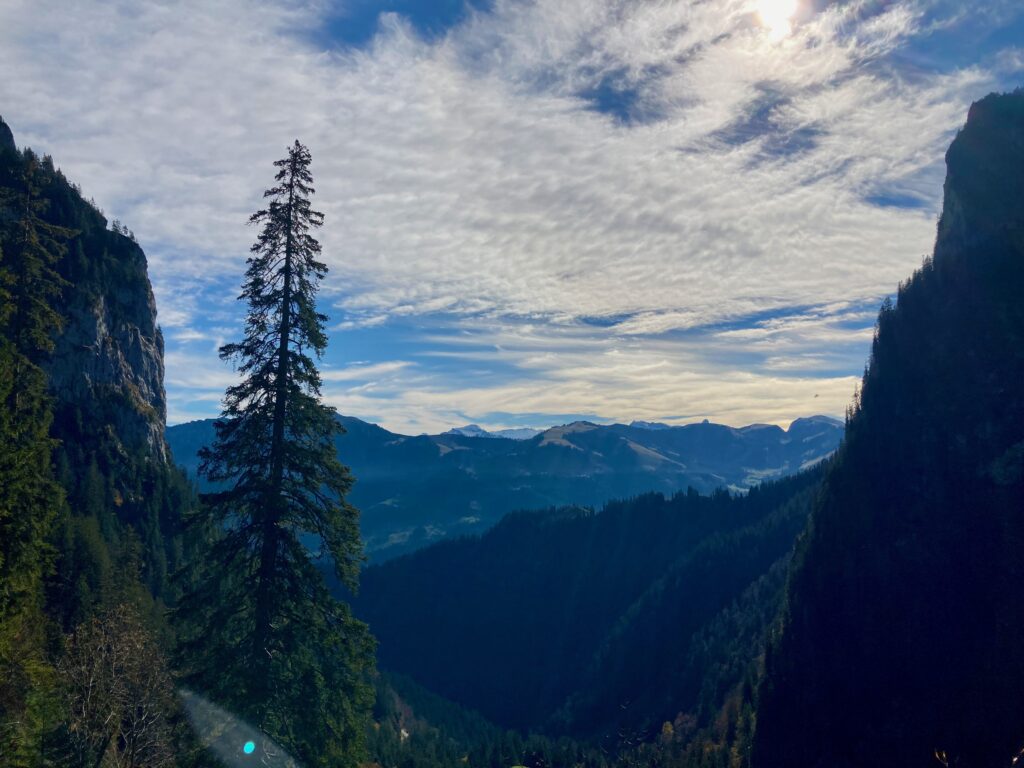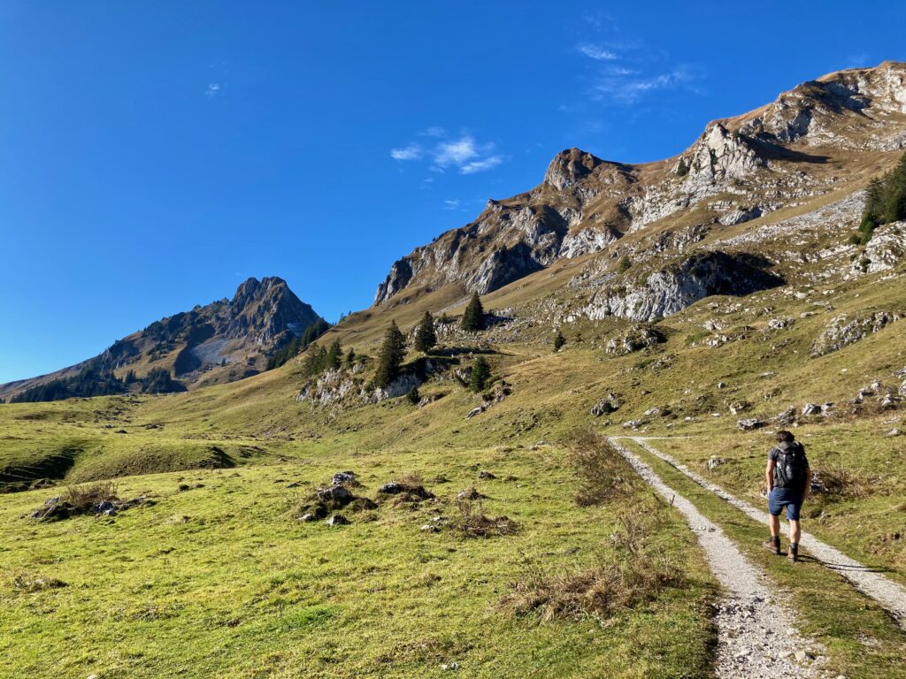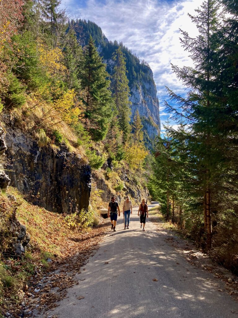 Der letzte Oktobertag hat sich wettertechnisch grandios angekündigt, und so habe ich mich mit Bea, Nina und Ben aufgemacht, in einer teils steilen aber von einer immer schöner werdenden Aussicht gekrönte Wanderung vom Simmental ins Gantrischgebiet zu queren. Der Zug ist rappelvoll mit Wandervolk, alle brav mit Maske, und so starten wir beim schnuckeligen Bahnhof Weissenburg in Richtung Weissenburgbad-Ruine. Gleich dahinter schlängelt sich der Wanderweg dem Buuschebach entlang bevor er steil und mittels eisernen Treppen zur schaukeligen Hängebrücke hochsteigt. Letztere ist ein echtes Highlight und für Schwindelfreie echt den Umweg wert!