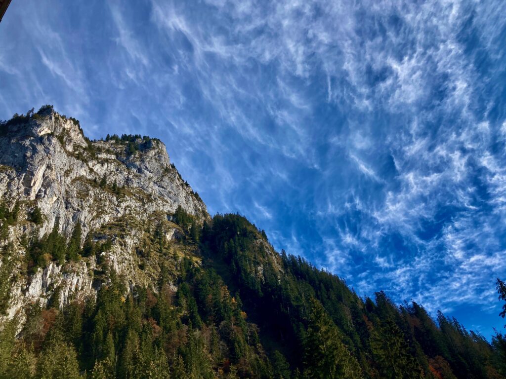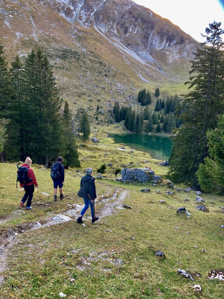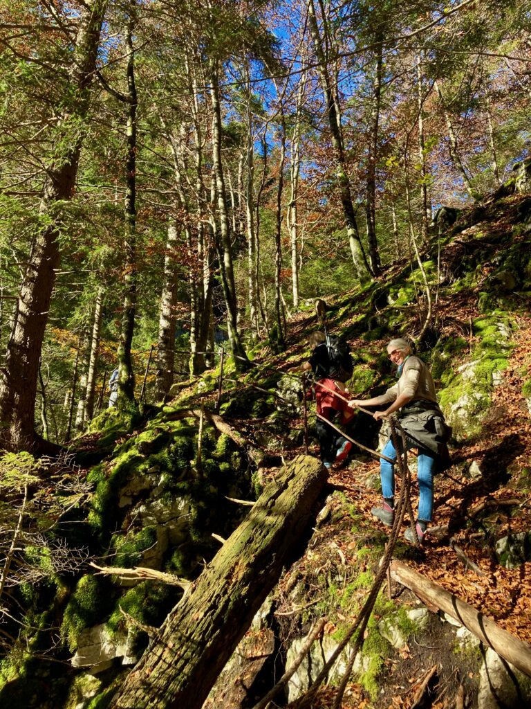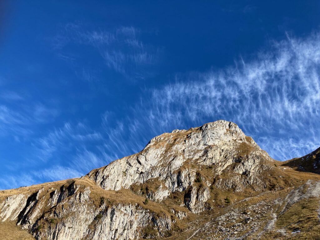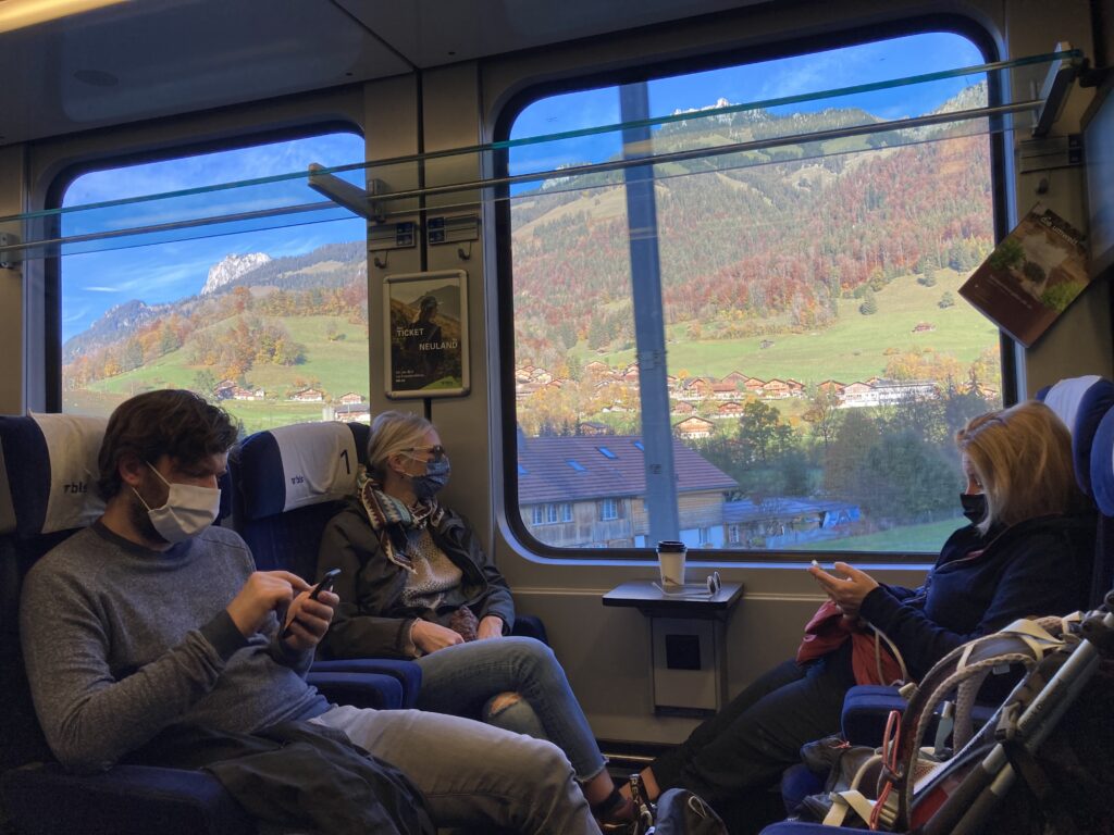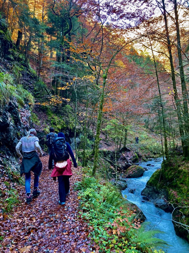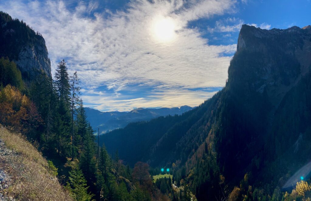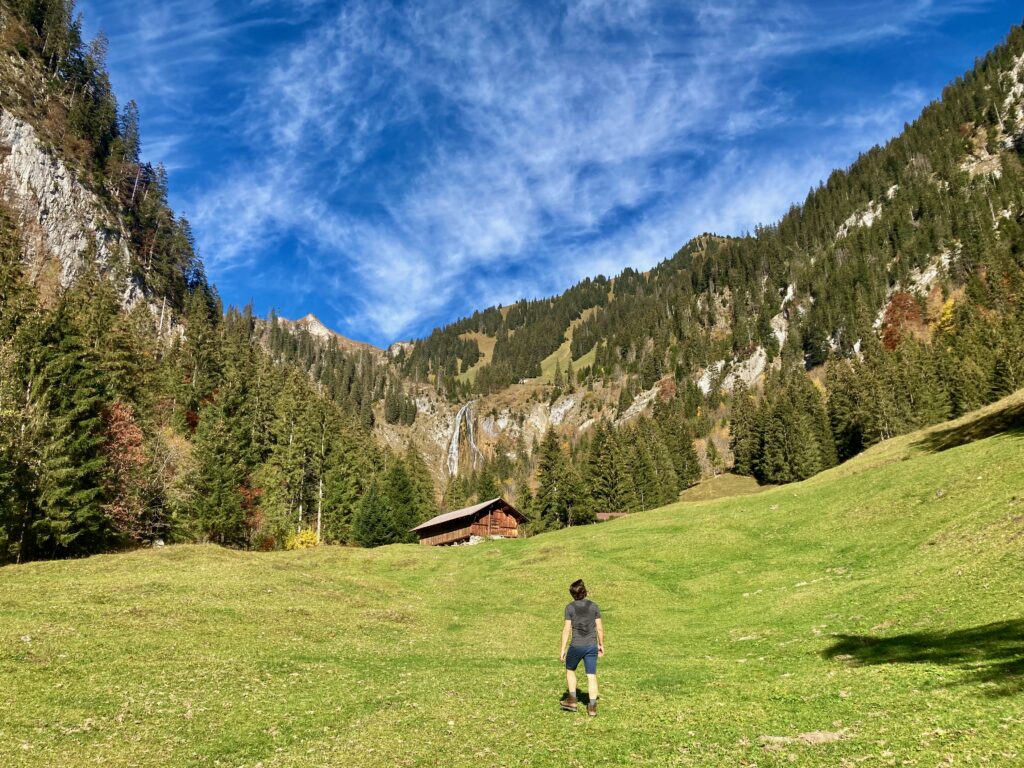Der letzte Oktobertag hat sich wettertechnisch grandios angekündigt, und so habe ich mich mit Bea, Nina und Ben aufgemacht, in einer teils steilen aber von einer immer schöner werdenden Aussicht gekrönte Wanderung vom Simmental ins Gantrischgebiet zu queren. Der Zug ist rappelvoll mit Wandervolk, alle brav mit Maske, und so starten wir beim schnuckeligen Bahnhof Weissenburg in Richtung Weissenburgbad-Ruine. Gleich dahinter schlängelt sich der Wanderweg dem Buuschebach entlang bevor er steil und mittels eisernen Treppen zur schaukeligen Hängebrücke hochsteigt. Letztere ist ein echtes Highlight und für Schwindelfreie echt den Umweg wert!