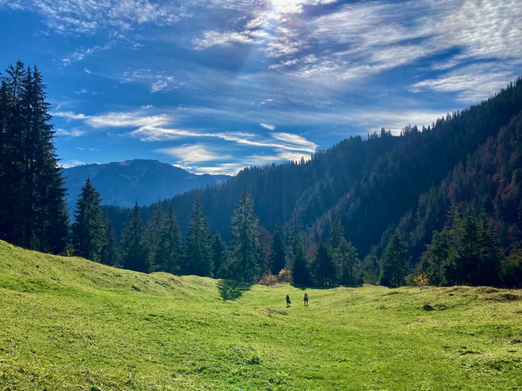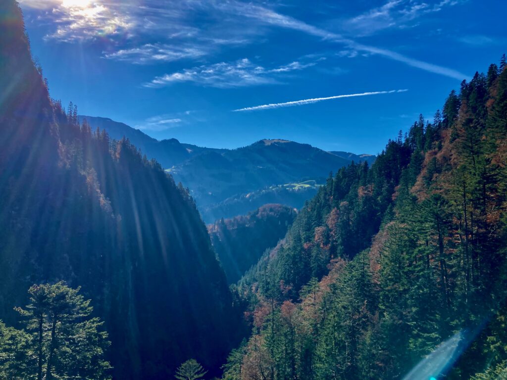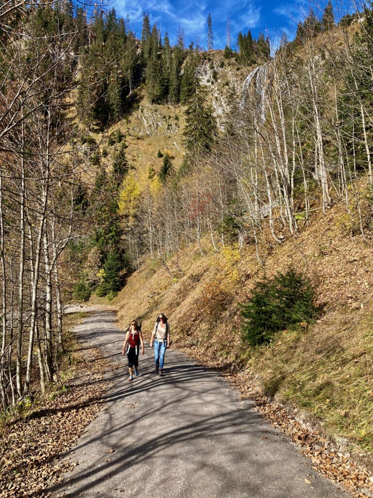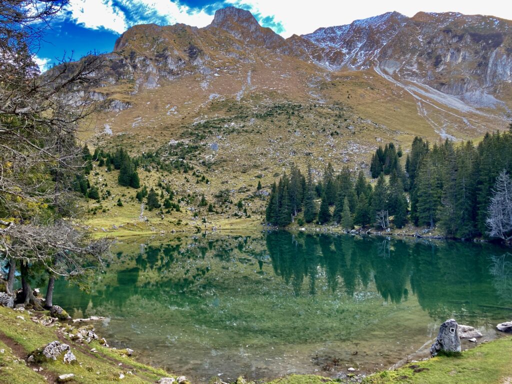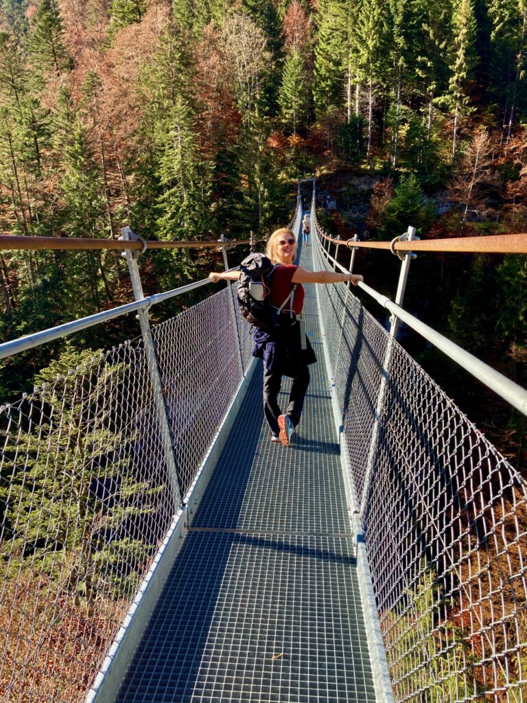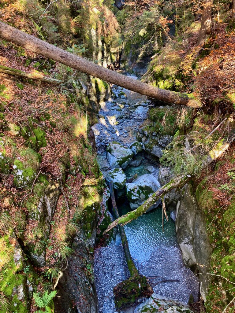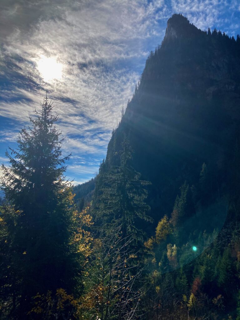 Der letzte Oktobertag hat sich wettertechnisch grandios angekündigt, und so habe ich mich mit Bea, Nina und Ben aufgemacht, in einer teils steilen aber von einer immer schöner werdenden Aussicht gekrönte Wanderung vom Simmental ins Gantrischgebiet zu queren. Der Zug ist rappelvoll mit Wandervolk, alle brav mit Maske, und so starten wir beim schnuckeligen Bahnhof Weissenburg in Richtung Weissenburgbad-Ruine. Gleich dahinter schlängelt sich der Wanderweg dem Buuschebach entlang bevor er steil und mittels eisernen Treppen zur schaukeligen Hängebrücke hochsteigt. Letztere ist ein echtes Highlight und für Schwindelfreie echt den Umweg wert!