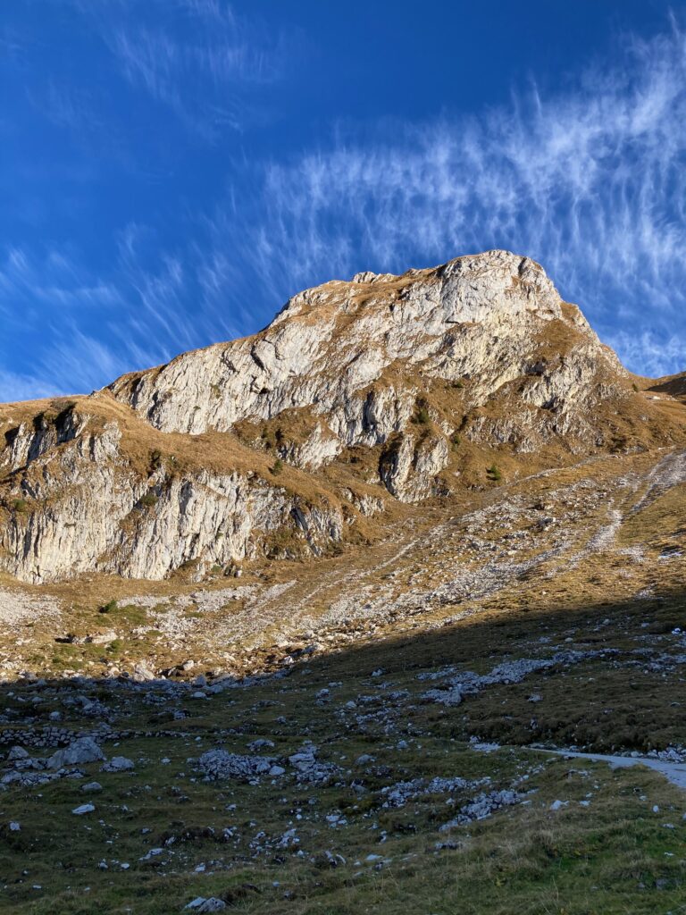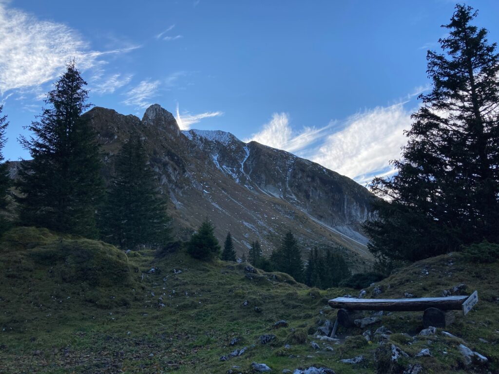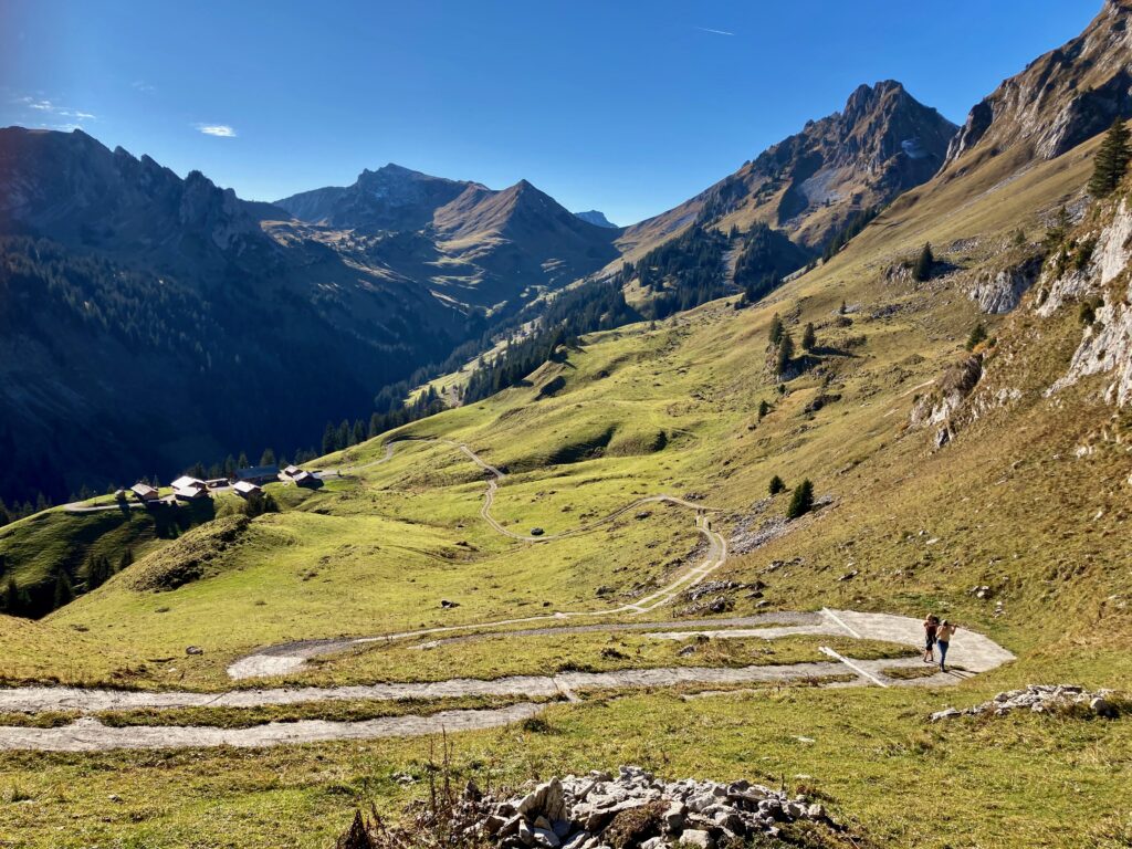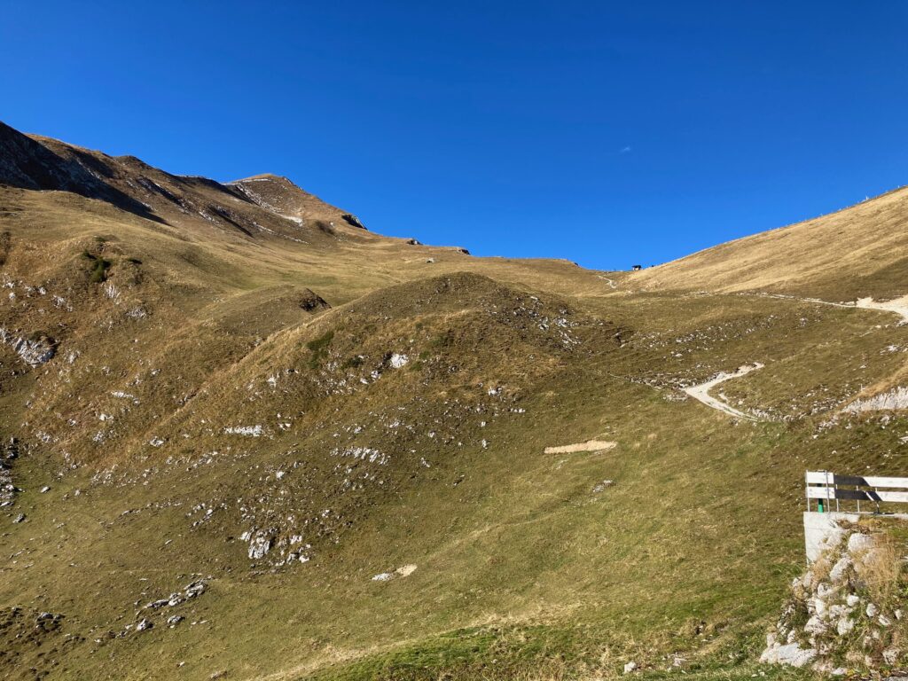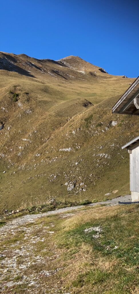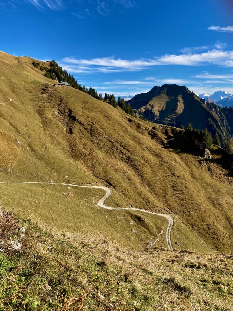 Danach geht es eher unspektakulär der Schotterpiste in Richtung Morgeten hoch, einzig die kurzen Waldpassagen mit den schönen Herbstfarben und die Alpweide Schönebode wissen zu begeistern. Der Aufstieg über die Guggershornkehren sowie der schattig-kalte Alpteil der Udriste Morgete finden wieder weniger Anklang, dafür unser Picknick-Plätzchen bei der geschlossenen Bergwirtschaft der Mittliste Morgete umso mehr! Der riesige Kupfer-Bottich lässt ansatzweise erahnen, wie lauschig ein Hotpot-Bad im Winter hier oben nach einer Skitour sein muss…