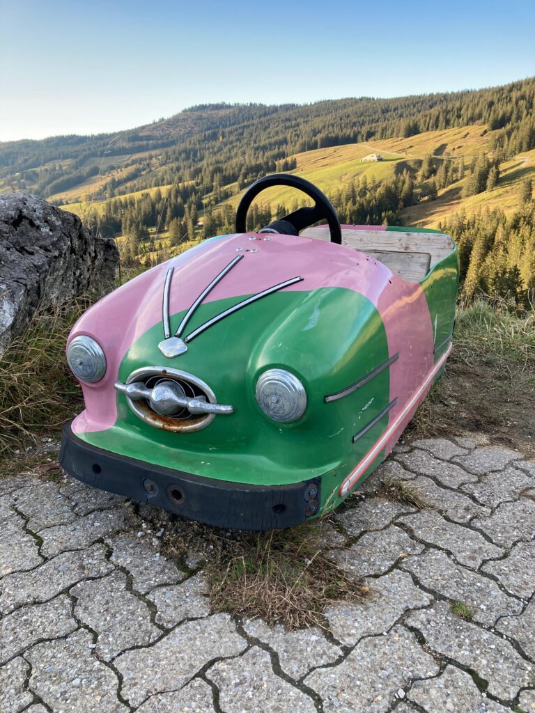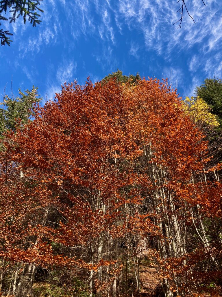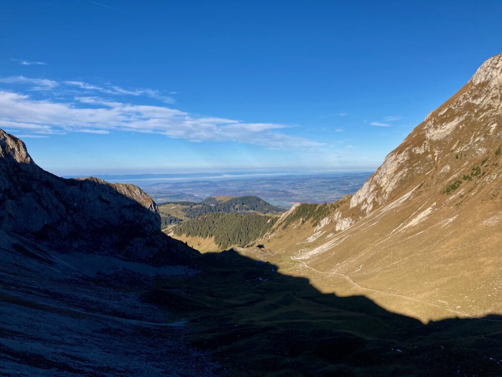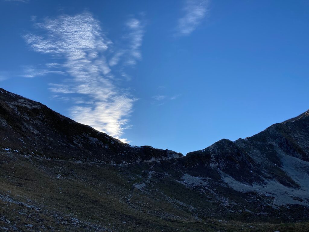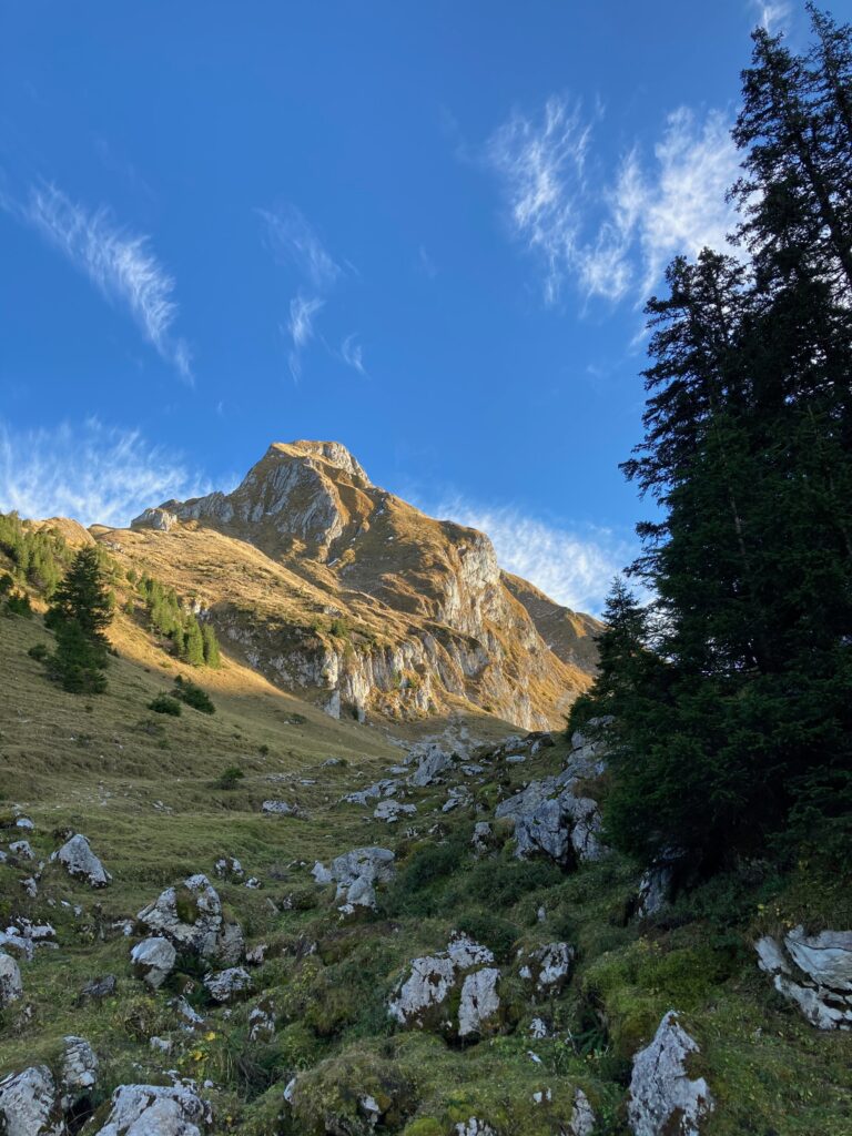Danach geht es eher unspektakulär der Schotterpiste in Richtung Morgeten hoch, einzig die kurzen Waldpassagen mit den schönen Herbstfarben und die Alpweide Schönebode wissen zu begeistern. Der Aufstieg über die Guggershornkehren sowie der schattig-kalte Alpteil der Udriste Morgete finden wieder weniger Anklang, dafür unser Picknick-Plätzchen bei der geschlossenen Bergwirtschaft der Mittliste Morgete umso mehr! Der riesige Kupfer-Bottich lässt ansatzweise erahnen, wie lauschig ein Hotpot-Bad im Winter hier oben nach einer Skitour sein muss…