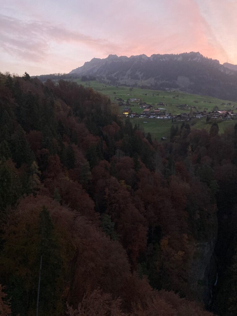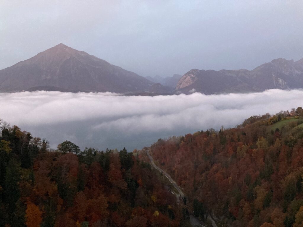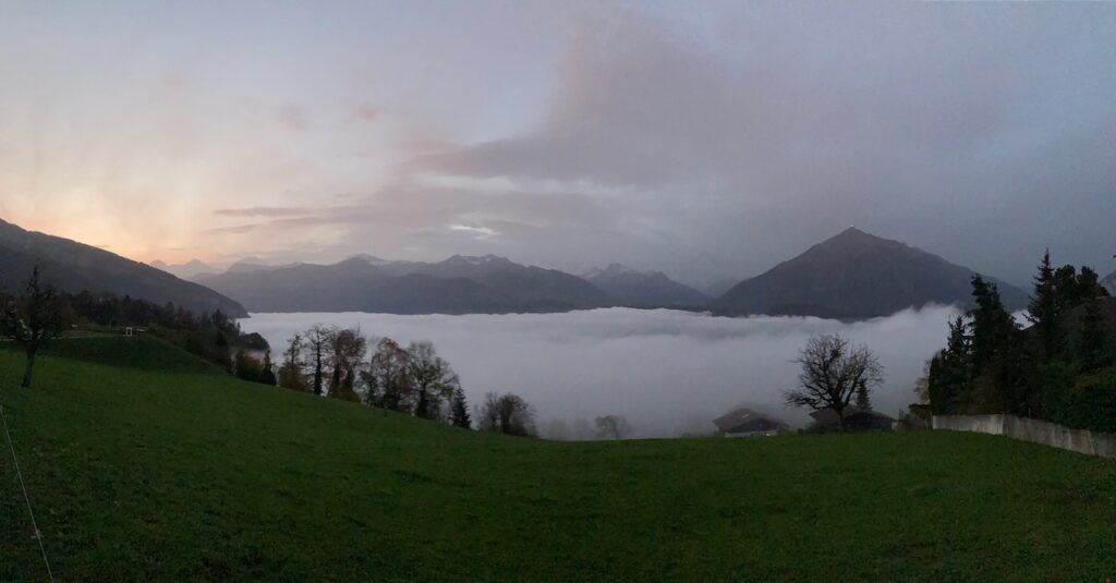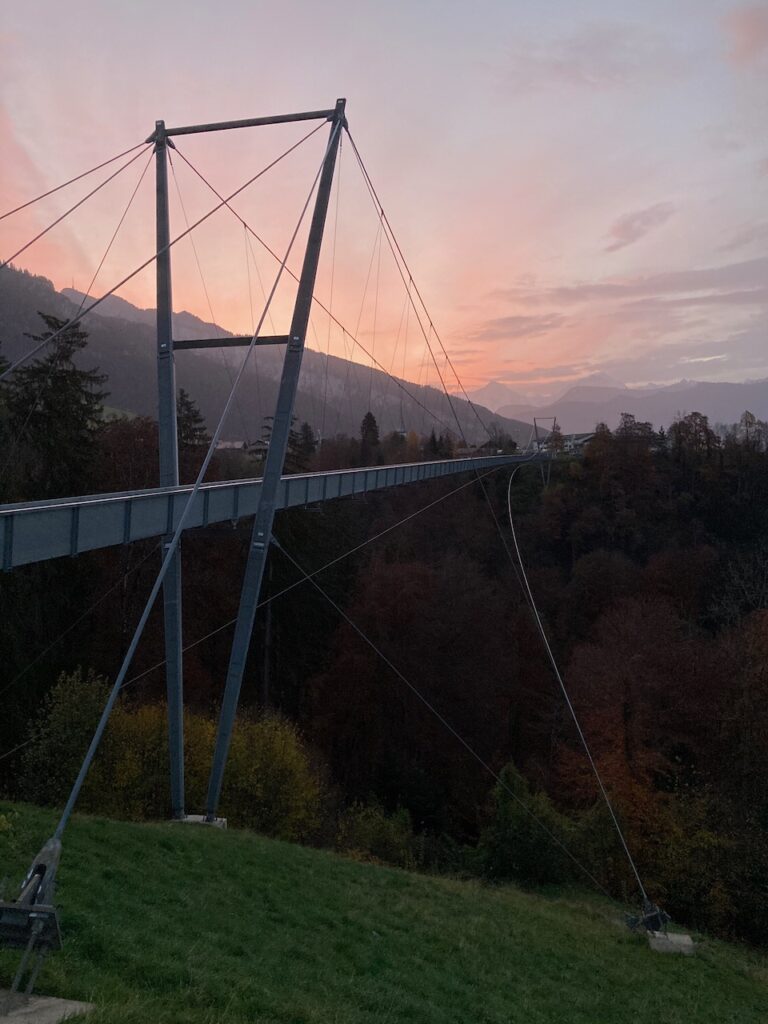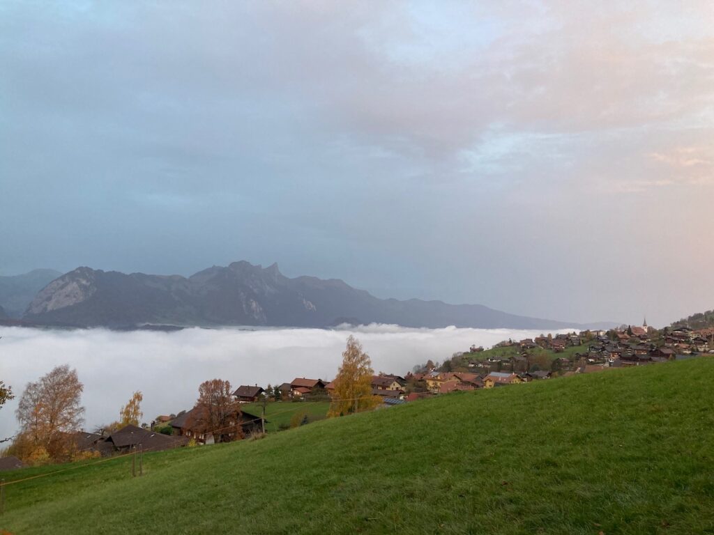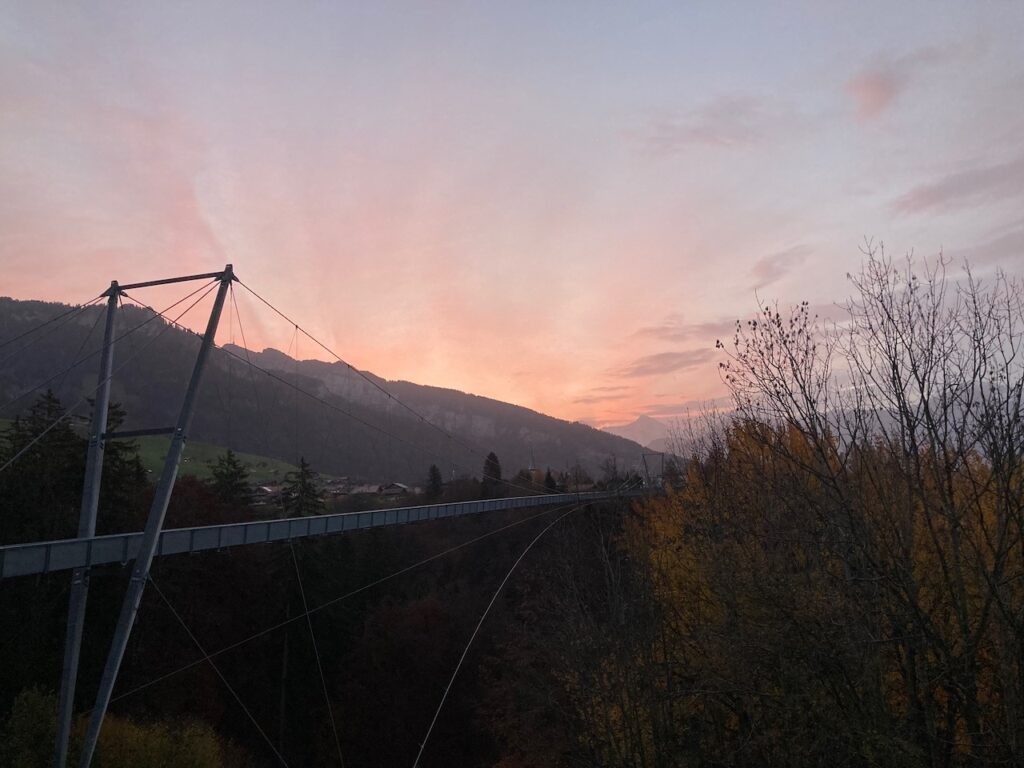 Die Wetterfrösche meinten fürs Wochenende unten grau, oben blau, deshalb habe ich meine Siebensachen gepackt und bin bereits kurz vor 7 Uhr ab Aeschlen Dorf losgelaufen, mit Tagesziel Habkern. Warum ich nicht in Schwanden Säge gestartet bin, ist ganz einfach: Ich habe vor kurzem einen Bericht über die Gunten-Hängebrücke gelesen, und da habe ich mir gesagt «Schafsloch und Bärenpfad mache ich ein andermal…». Glücklicherweise endet kurz vor Aeschlen der dicke Nebel, und so begrüsst mich der Tag mit einem rosaroten Leuchten…