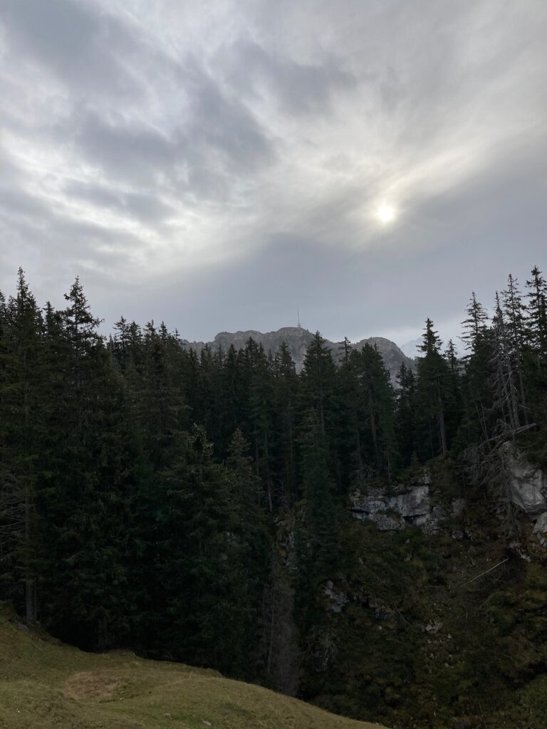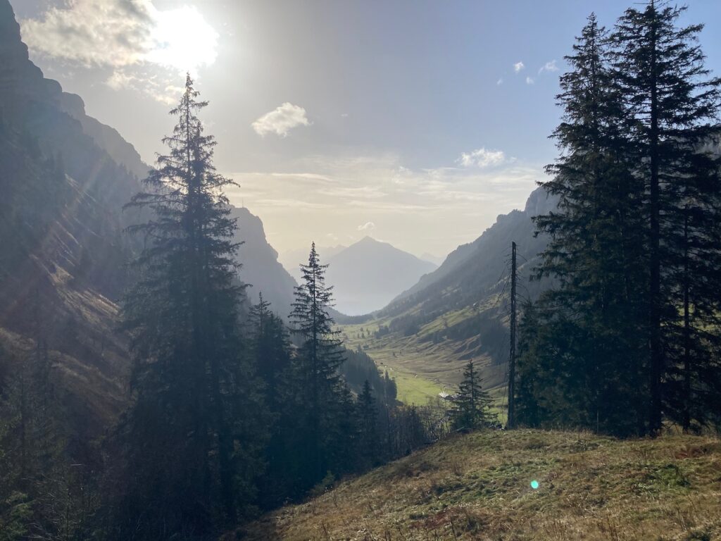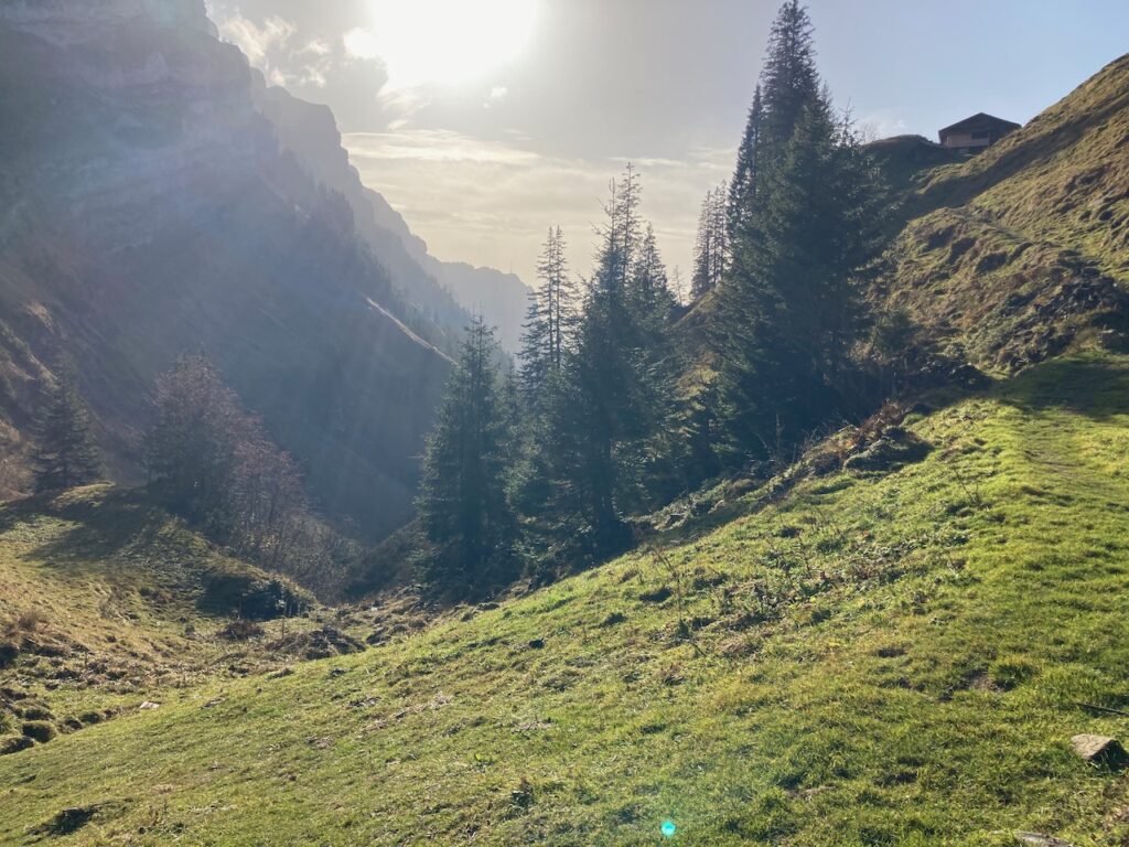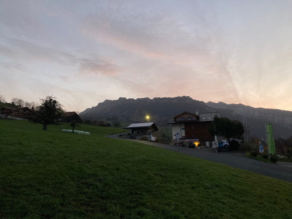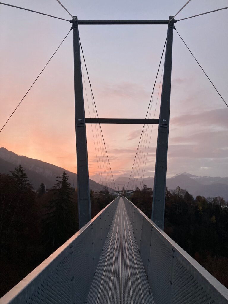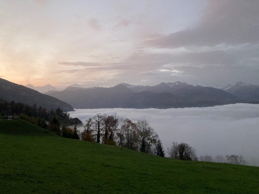 Die Wetterfrösche meinten fürs Wochenende unten grau, oben blau, deshalb habe ich meine Siebensachen gepackt und bin bereits kurz vor 7 Uhr ab Aeschlen Dorf losgelaufen, mit Tagesziel Habkern. Warum ich nicht in Schwanden Säge gestartet bin, ist ganz einfach: Ich habe vor kurzem einen Bericht über die Gunten-Hängebrücke gelesen, und da habe ich mir gesagt «Schafsloch und Bärenpfad mache ich ein andermal…». Glücklicherweise endet kurz vor Aeschlen der dicke Nebel, und so begrüsst mich der Tag mit einem rosaroten Leuchten…