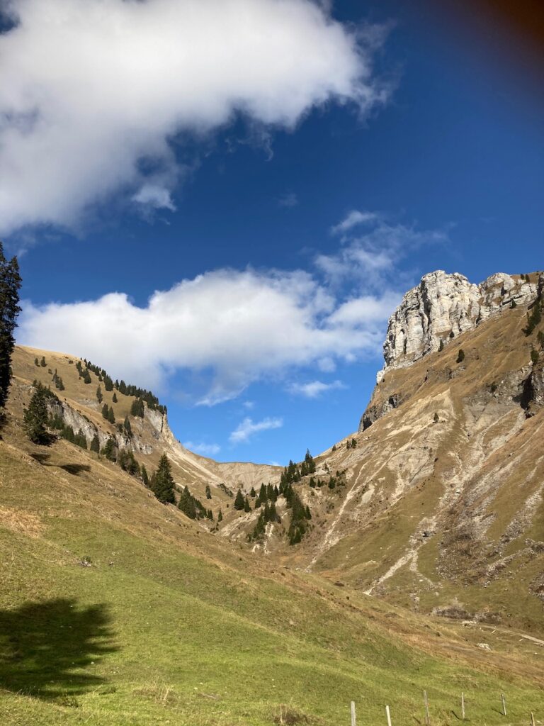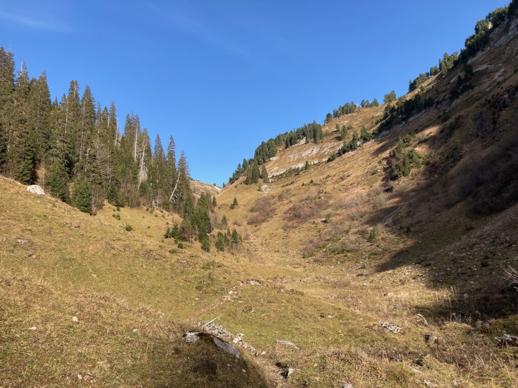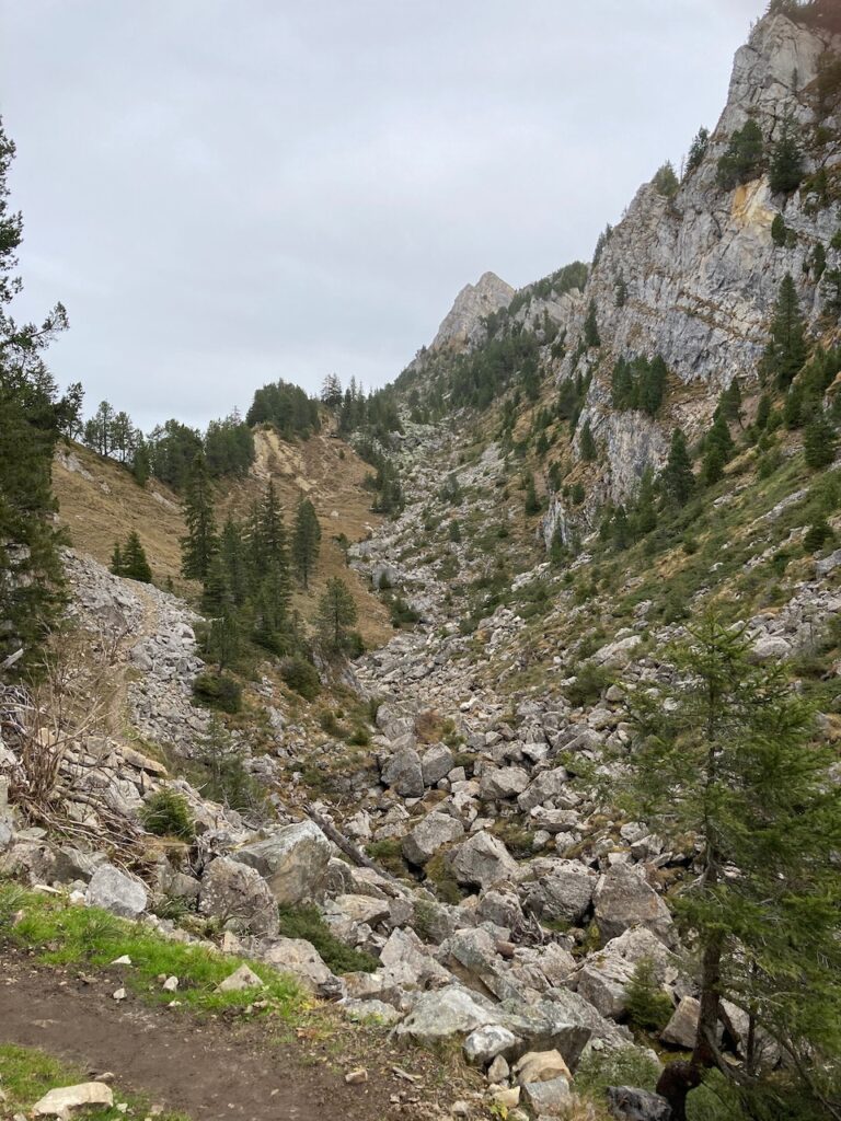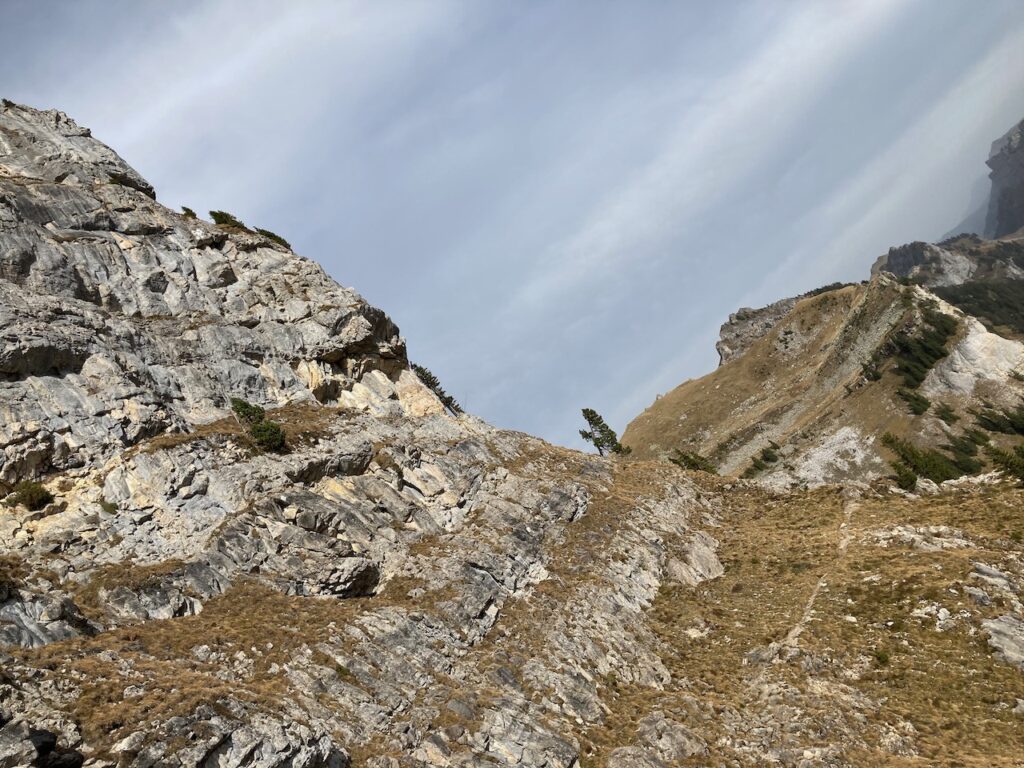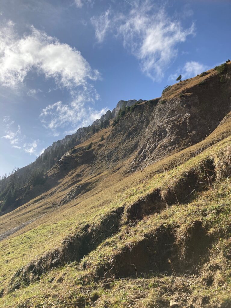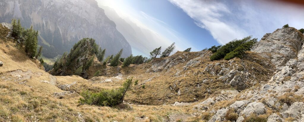 Etwas gequält erreiche ich die Alp unterhalb Chalberwang, wo ich – diesmal um Höhenmeter zu sparen – links ab direkt hoch zum Chumeli laufe. Wo wir vor ein paar Monaten noch quasi im Bachbett laufen mussten (siehe Hike#23) ist es heuer etwas trockener. Nach einer kurzen Pause packe ich den letzten grossen Aufstieg an, direkt hoch zur Loubenegg. Der Weg ist schlecht markiert (gilt auch nicht als offizieller Bergwanderweg!), an einer Stelle drifte ich ab und mühe mich mittels einer Kraxelpartie einen Abhang hoch. Hätte ich eigentlich nicht mehr gebraucht, doch langsam wird es merklich kühler auf der Schattseite des Gemmenalphorn… jetzt heisst es Zähne zusammenbeissen!