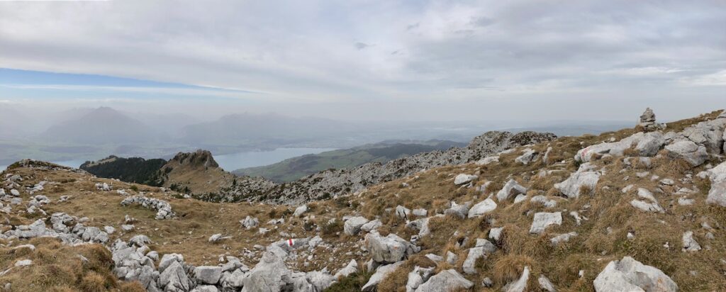 Nach dem stolprigen Aufstieg zum Gipfel geniesse ich mutterseelenallein mein frühes Zmittag, die frechen Alpendohlen kriegen auch etwas ab. In unregelmässigen Abständen taucht die Sonne hinter den Schleierwolken hervor, und plötzlich ist die Hölle los. Ein Schwall von Hikern, Trail-Runnern und sogar zwei Ehepaare mit Hunden überschwemmt den Gipfel, höchste Zeit das Weite zu suchen. Technisch anspruchsvoll geht es unterhalb des Gipfels durch, der Wanderweg macht einen grossen Bogen bis zum kleinen Pass oberhalb des vorderen Schafläger. Von da weg sind nur noch wenige unterwegs, zum Glück…