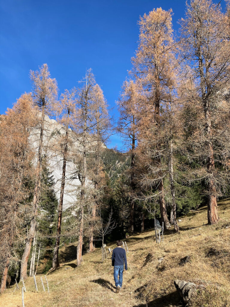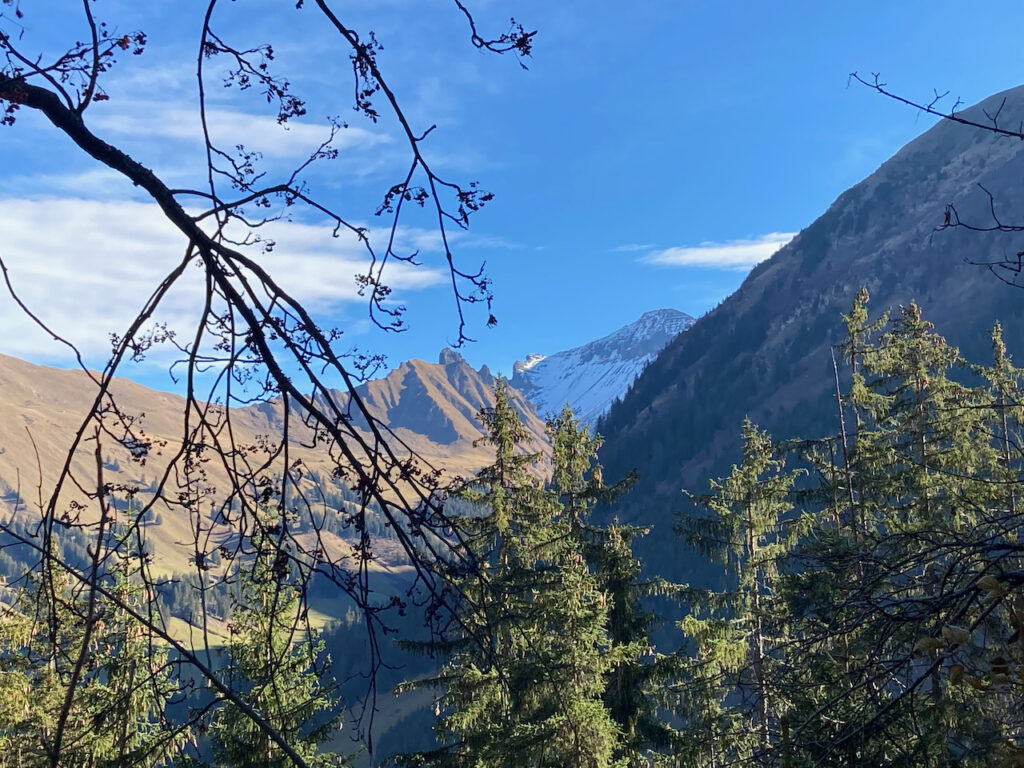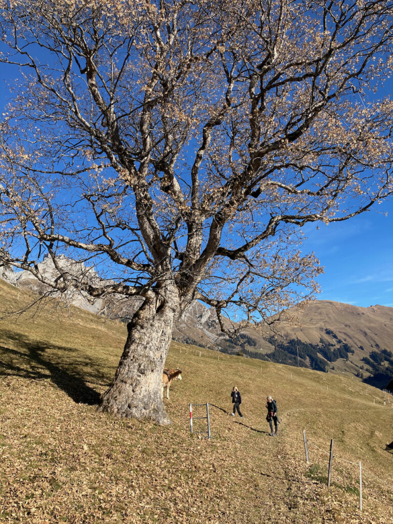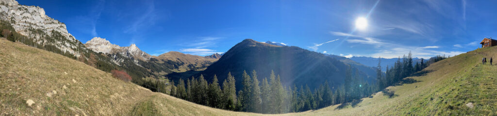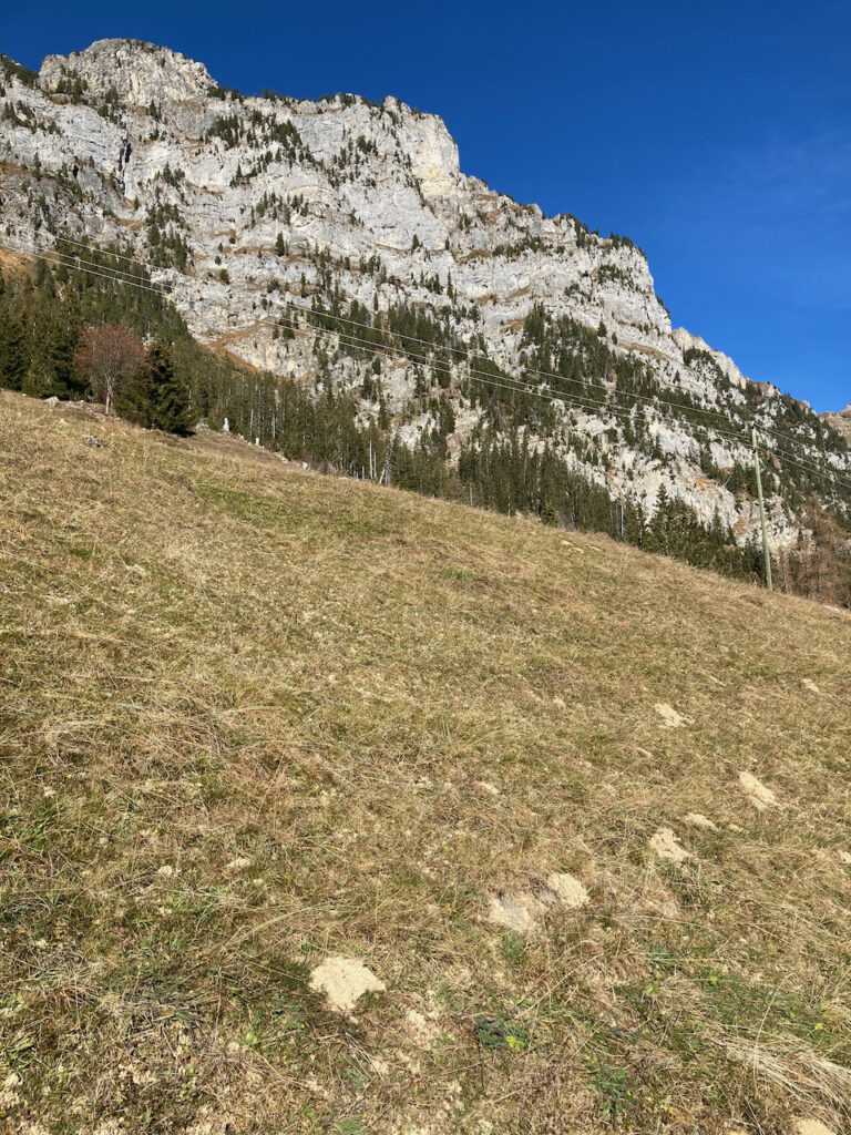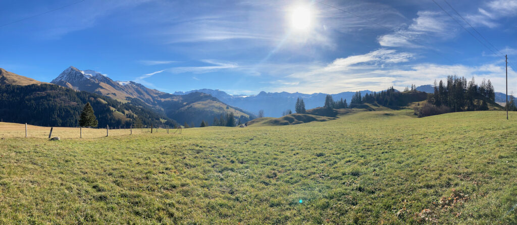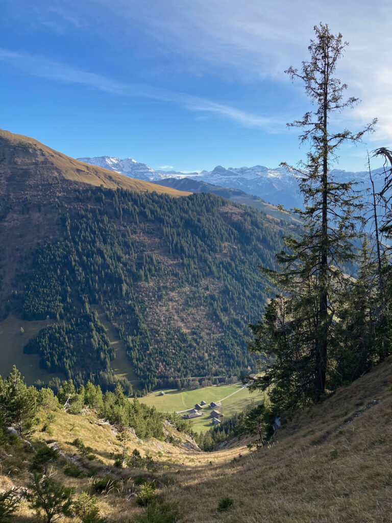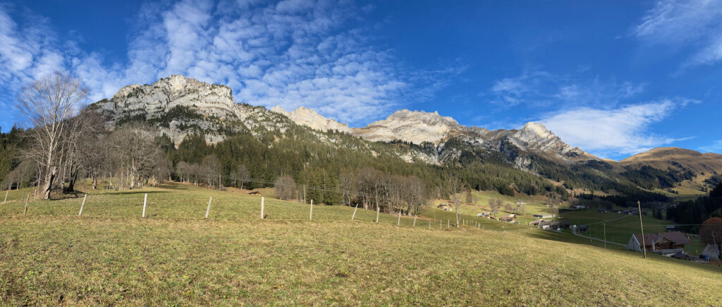 Mitte November und das Wochenende präsentiert sich wiederum überraschend mild, so steigen wir in unseren Elektroflitzer und treffen Ben und Nina beim Restaurant Alperose im Färmeltal ob St. Stephan. Zugegebenermassen hatte ich auch noch nie von diesem Tal gehört, es hat sich zu einem echten Hingucker erwiesen… doch seht selbst! Oberhalb von Stalden geht es schnurgerade durch duftend-gedüngte Wiesen hoch bis zum Höhenweg (siehe verlinkten Färmeltag-Weg am Ende dieses Posts), dann biegen wir links ab in Richtung Dachbode, die grossen Höhenmeter wollen wir uns nicht gleich zu Beginn antun. Von der Fernsicht in Richtung Plaine Morte – Ebene und den massiven Bergahornen angetan, machen wir einen grossen Bogen ums Schafbärgli, bis gegen Norden zwischen Gandhore und Brunnihore auf dem dazwischenliegenden Sattel unser Picknick-Plätzchen auftaucht… zuerst die Arbeit, dann das Vergnügen.