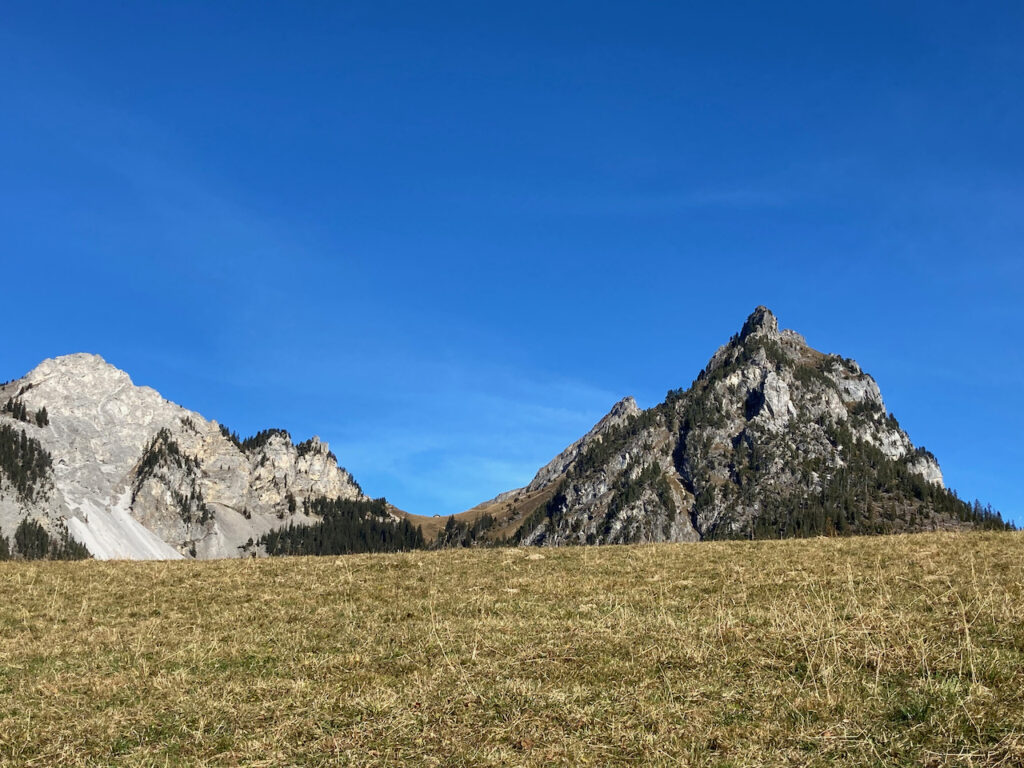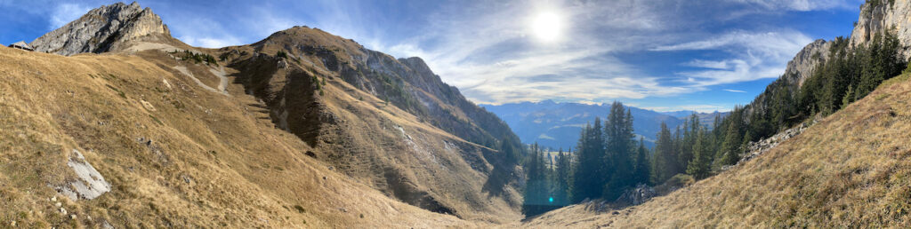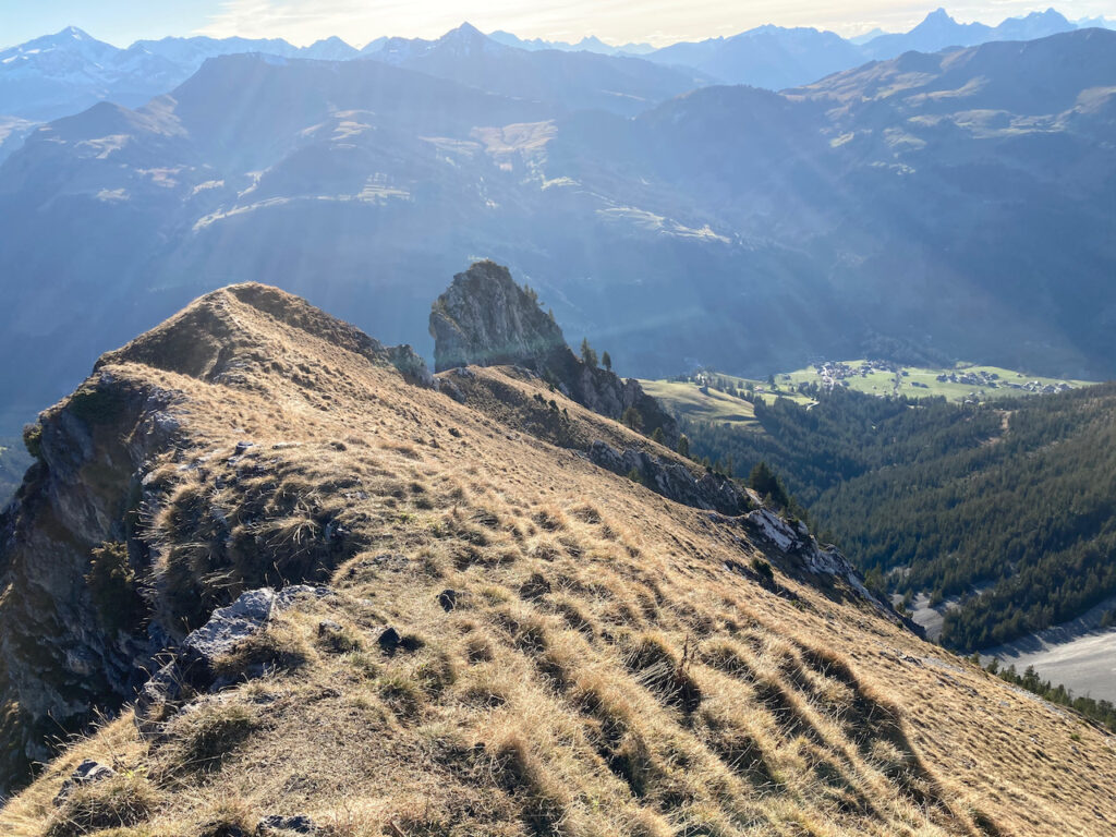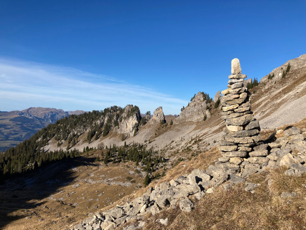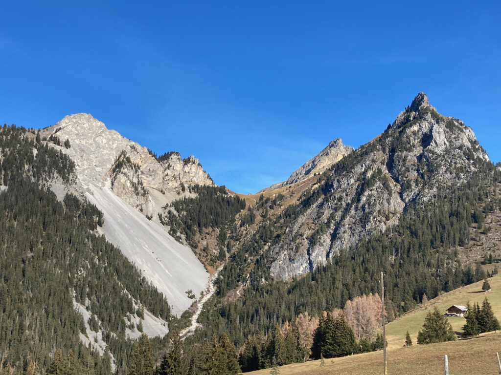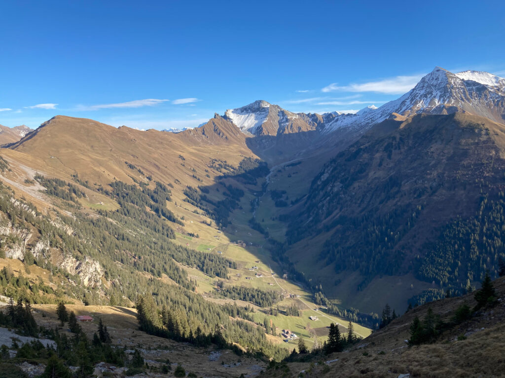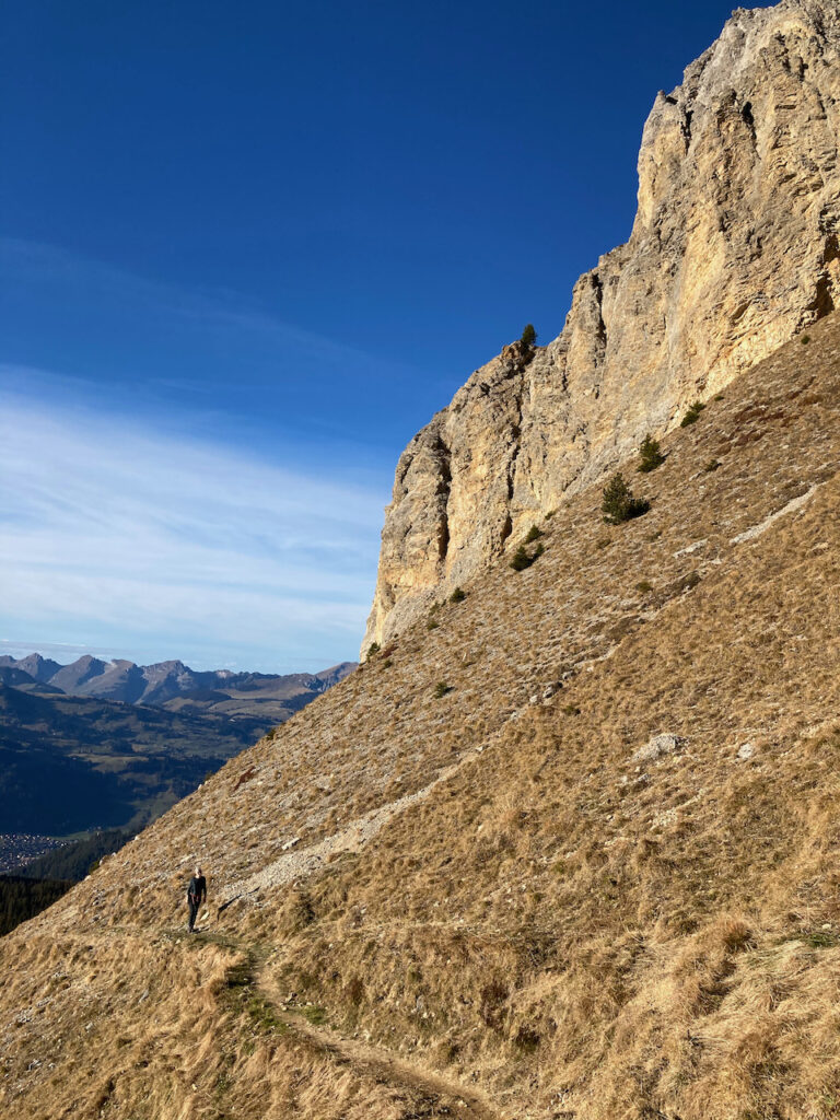 Mitte November und das Wochenende präsentiert sich wiederum überraschend mild, so steigen wir in unseren Elektroflitzer und treffen Ben und Nina beim Restaurant Alperose im Färmeltal ob St. Stephan. Zugegebenermassen hatte ich auch noch nie von diesem Tal gehört, es hat sich zu einem echten Hingucker erwiesen… doch seht selbst! Oberhalb von Stalden geht es schnurgerade durch duftend-gedüngte Wiesen hoch bis zum Höhenweg (siehe verlinkten Färmeltag-Weg am Ende dieses Posts), dann biegen wir links ab in Richtung Dachbode, die grossen Höhenmeter wollen wir uns nicht gleich zu Beginn antun. Von der Fernsicht in Richtung Plaine Morte – Ebene und den massiven Bergahornen angetan, machen wir einen grossen Bogen ums Schafbärgli, bis gegen Norden zwischen Gandhore und Brunnihore auf dem dazwischenliegenden Sattel unser Picknick-Plätzchen auftaucht… zuerst die Arbeit, dann das Vergnügen.
