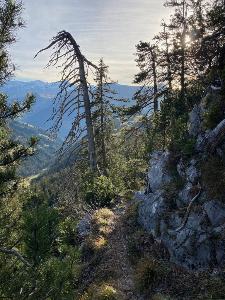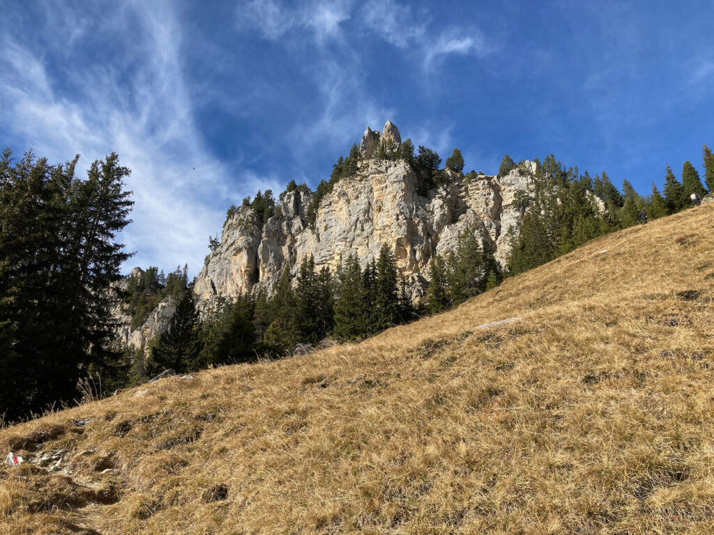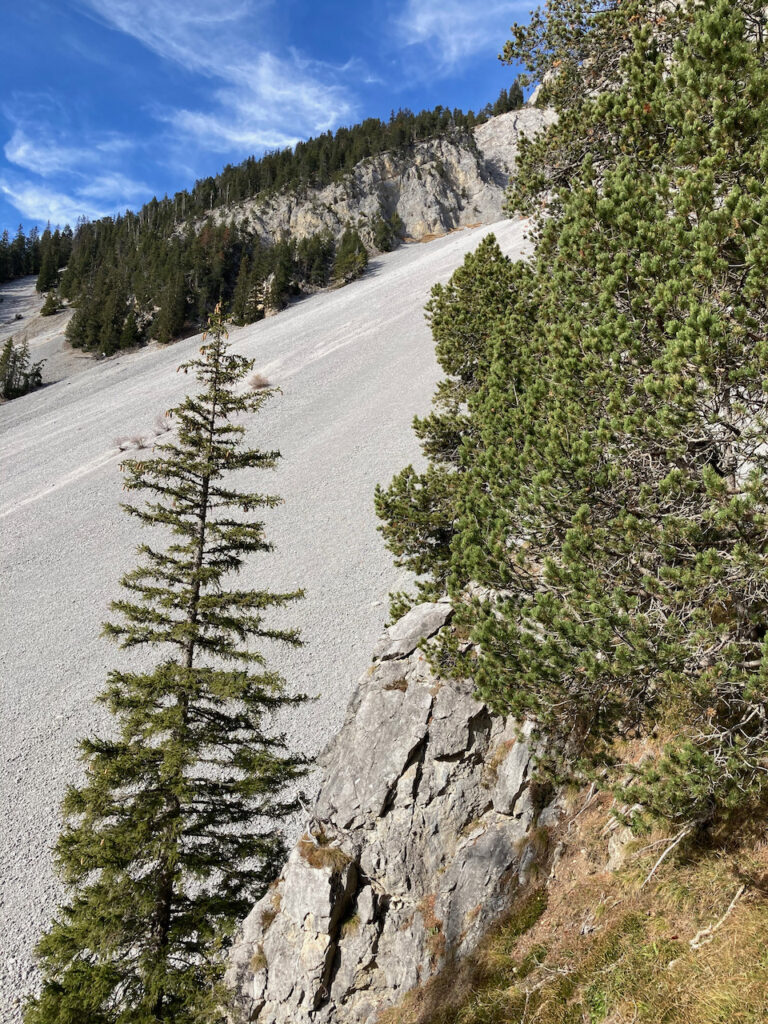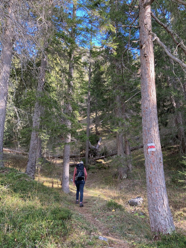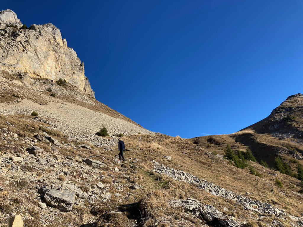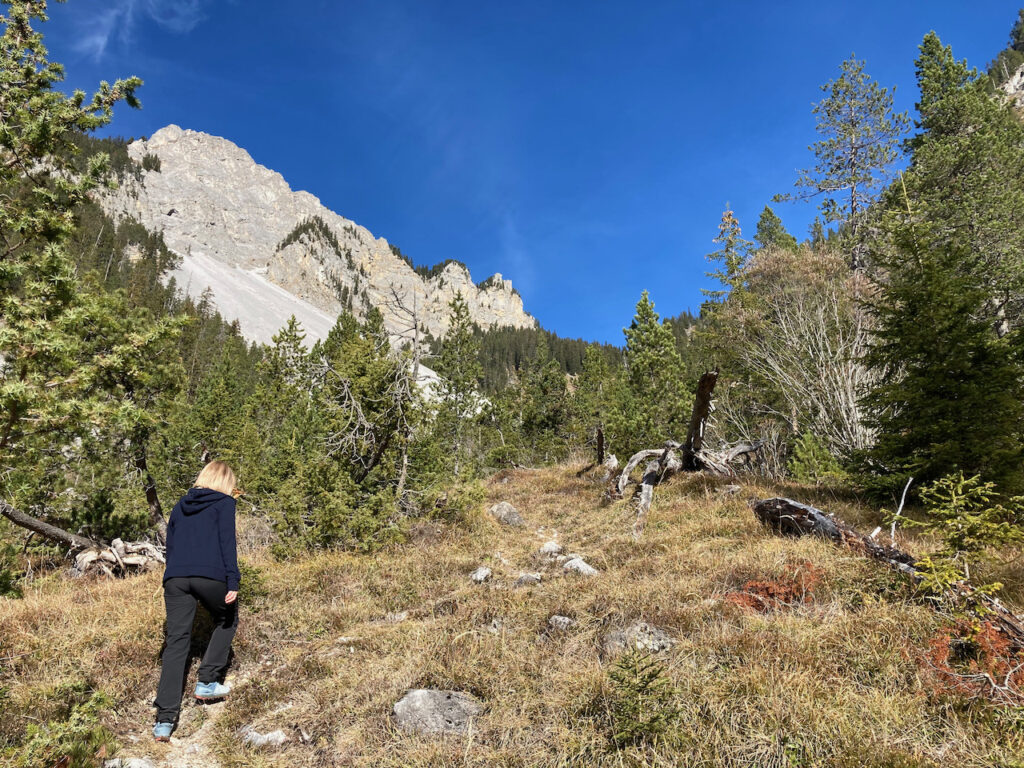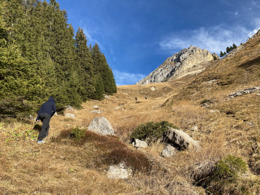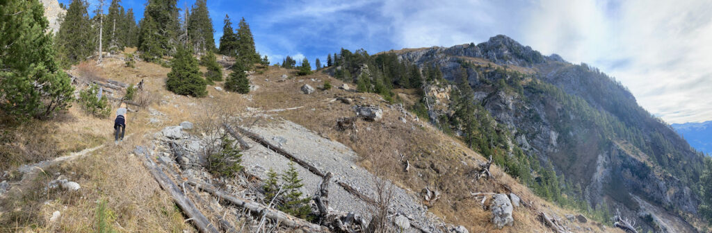 Am obere Stutz queren wir auf einem nicht-markierten aber umso reizvolleren, fast schon abenteuerlichen Wanderweg das Kiefernwäldchen, das sich bis unter das massive Geröllfeld der Breitgand hochzieht. Von da weg geht es wieder auf weiss-rot-weissem Wanderweg steil hinauf, kurz vor dem Sattel steigen wir noch auf einer trockenen Bergwiese die letzten Meter zum Sattel hoch.