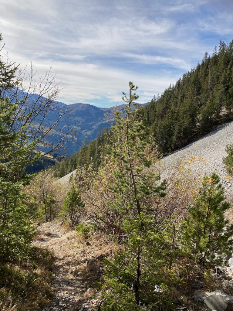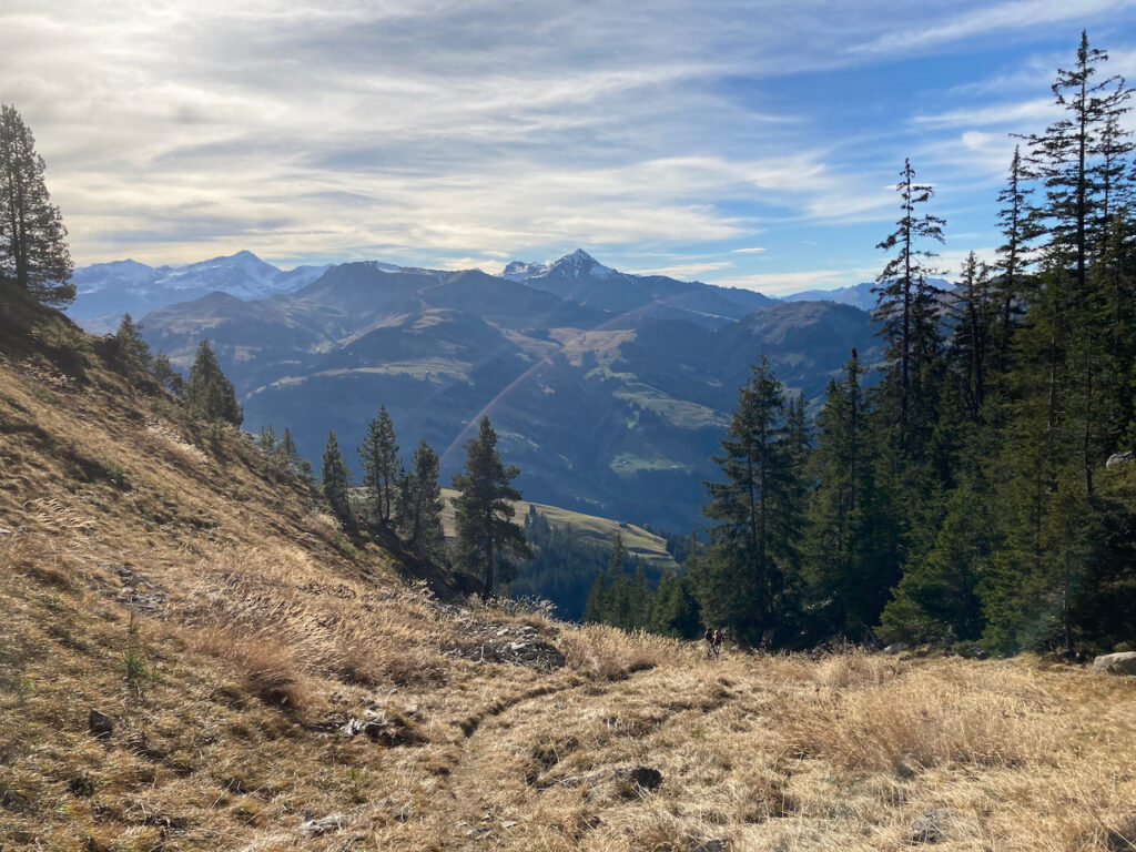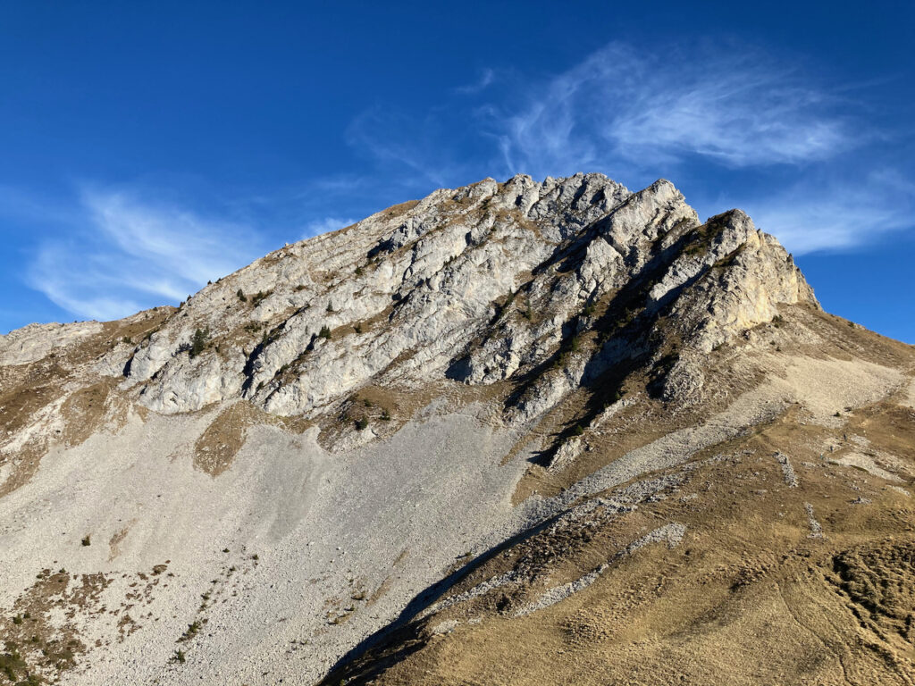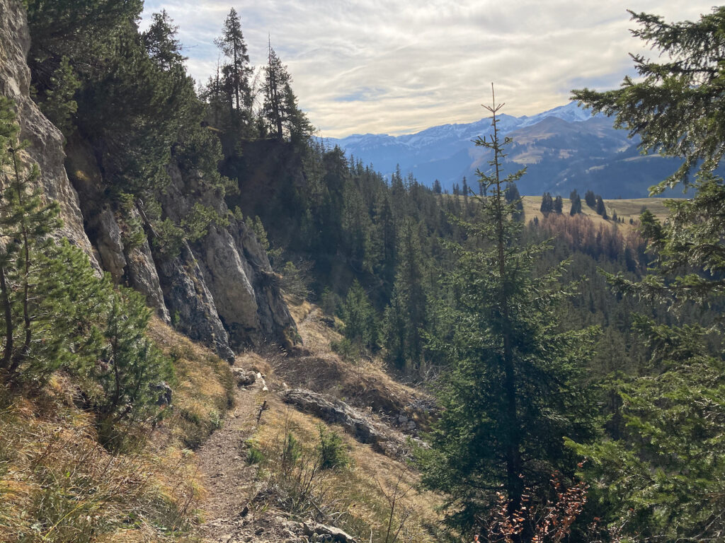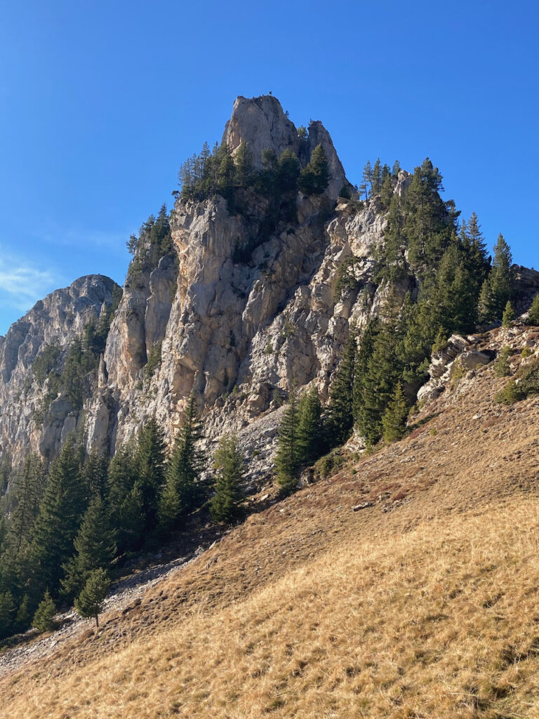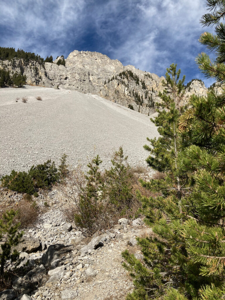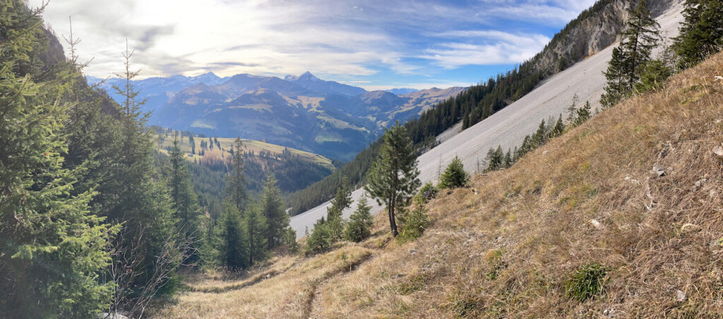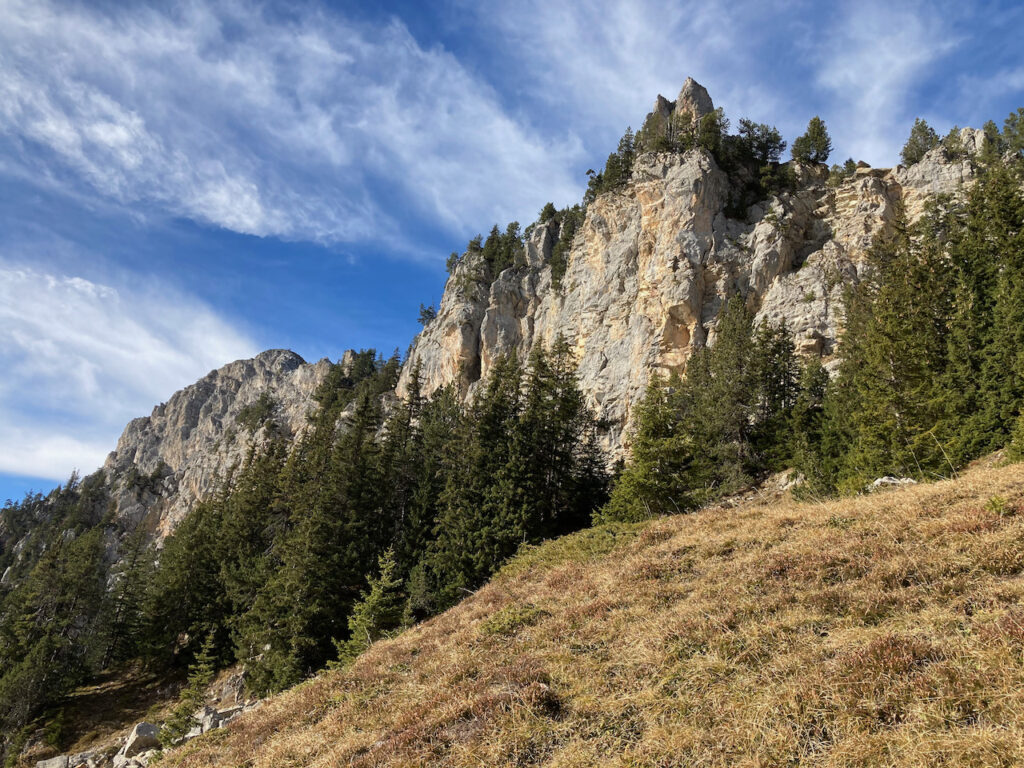 Am obere Stutz queren wir auf einem nicht-markierten aber umso reizvolleren, fast schon abenteuerlichen Wanderweg das Kiefernwäldchen, das sich bis unter das massive Geröllfeld der Breitgand hochzieht. Von da weg geht es wieder auf weiss-rot-weissem Wanderweg steil hinauf, kurz vor dem Sattel steigen wir noch auf einer trockenen Bergwiese die letzten Meter zum Sattel hoch.