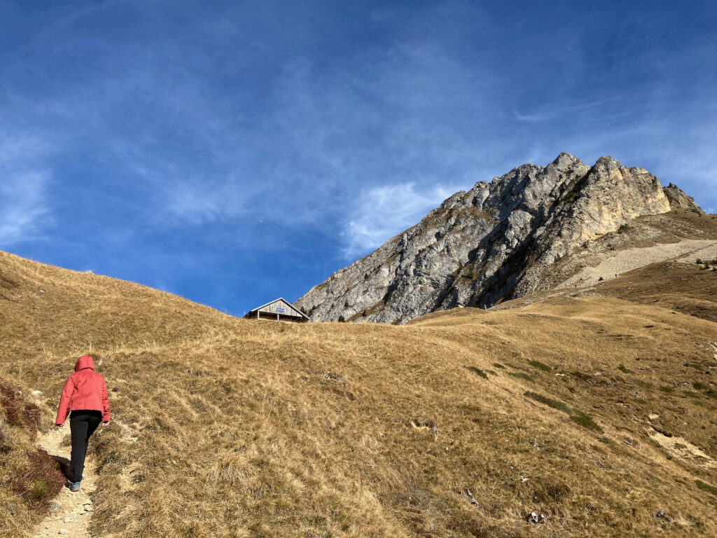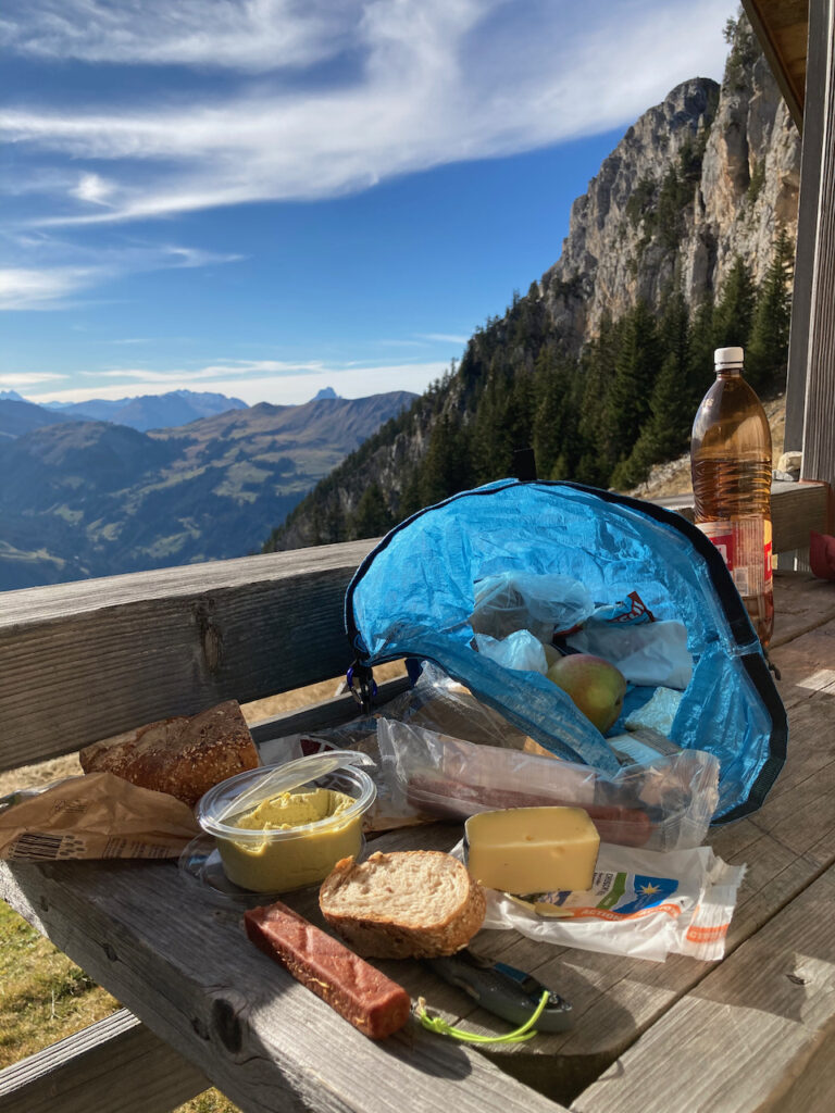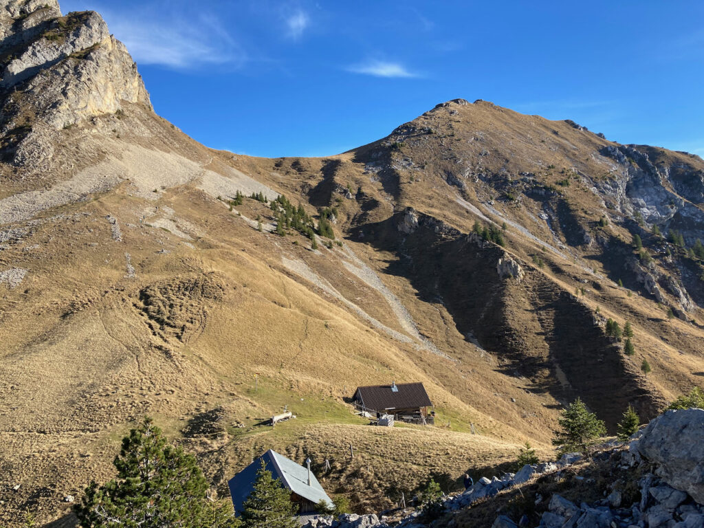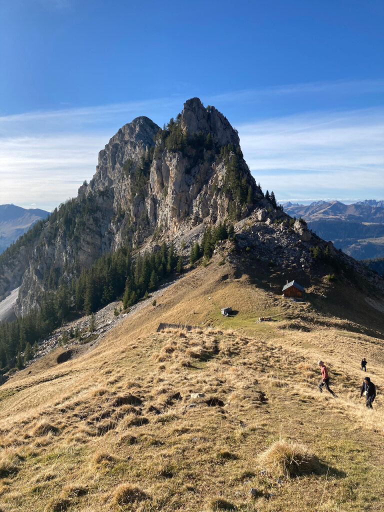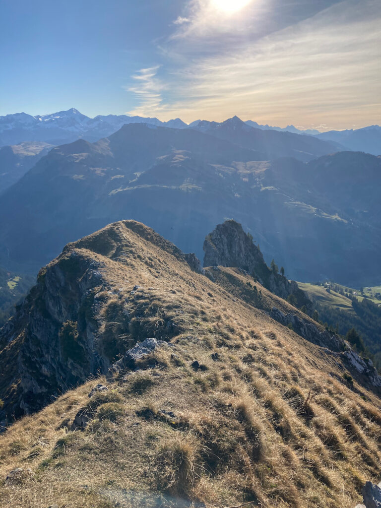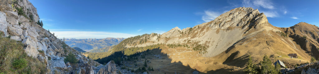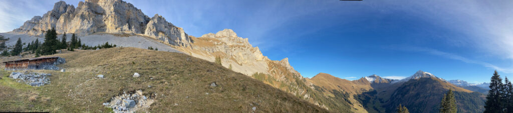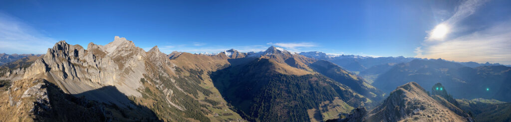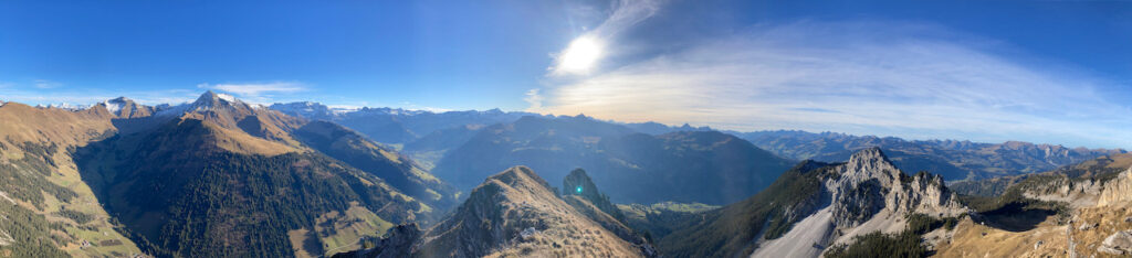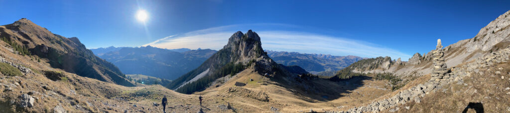 Uns sind einige Wanderer unterwegs begegnet, und so können wir von Glück reden, dass wir die sonnige Terrasse und Vorplätzchen der (vollständig verrammelten) Hütte ganz für uns in Anspruch nehmen können. Gestärkt blicken wir noch kurz um die Ecke in Richtung Hundsrügg und Gastlosen, dann geht’s noch die letzten paar Höhenmeter hoch zum nächsten Sattel zwischen Brunnihore und Mieschflue, wo ich mich für ein paar Panorama-Fotos noch von Bea, Nina und Ben kurz verabschiede, den Gipfel kann ich so einfach nicht stehen lassen…