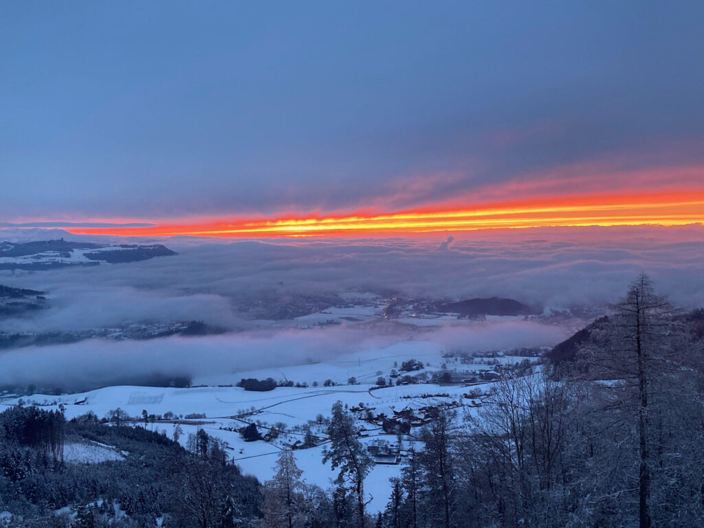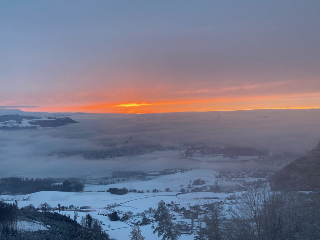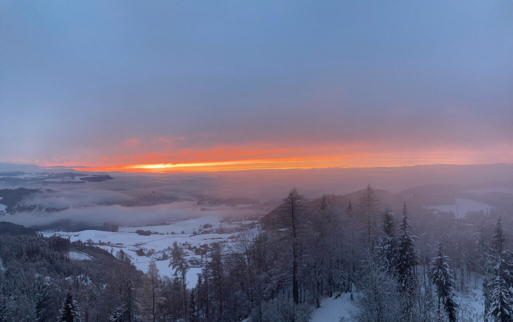 Unten grau, oben blau hatten wir, heute ging es darum, im ersten Schnee und bei knackiger Kälte einen der spektakulären Sonnenuntergänge auf dem Bantiger fotografisch festzuhalten. Und das ist mir und Dänu wahrlich gelungen.