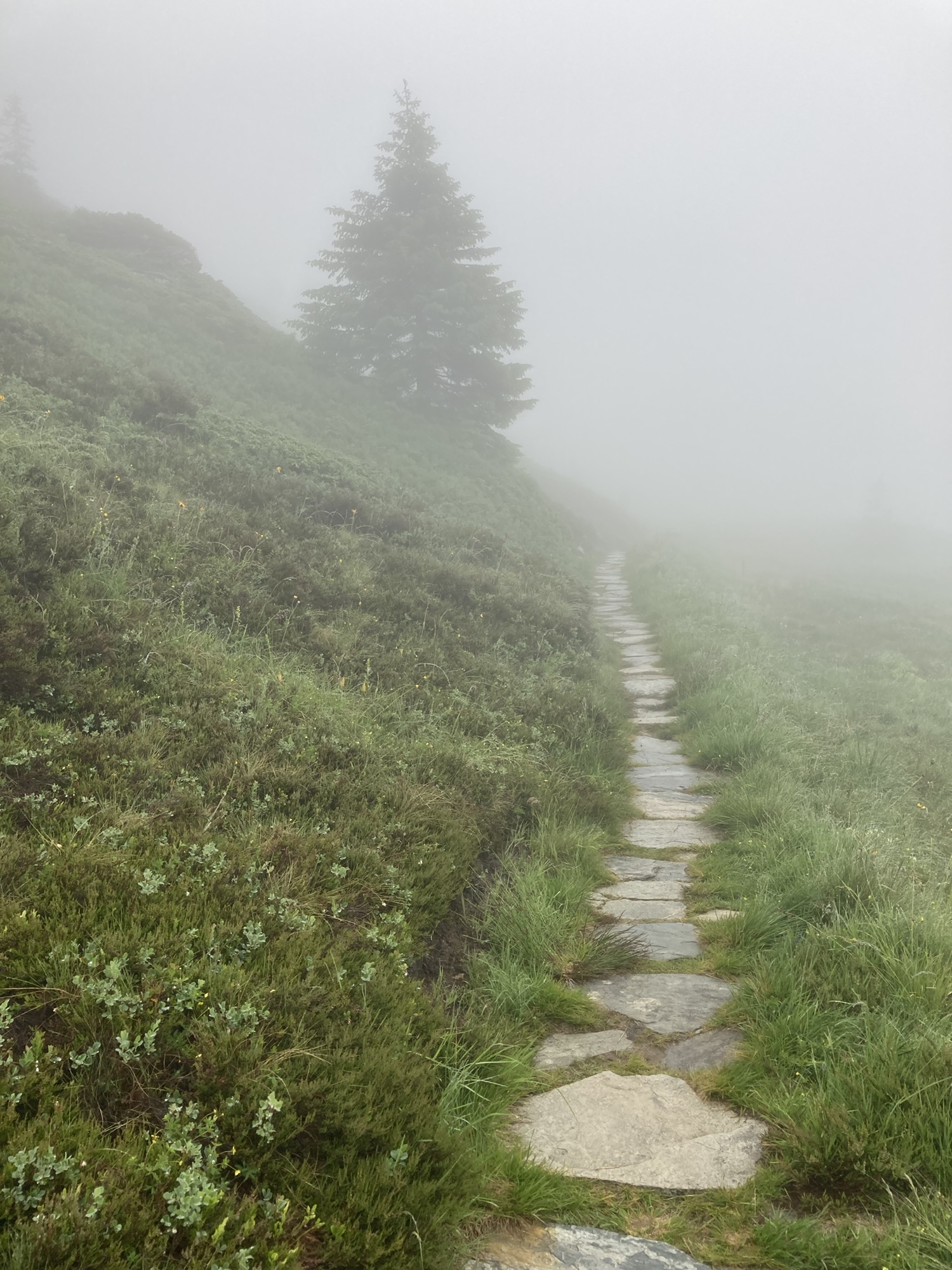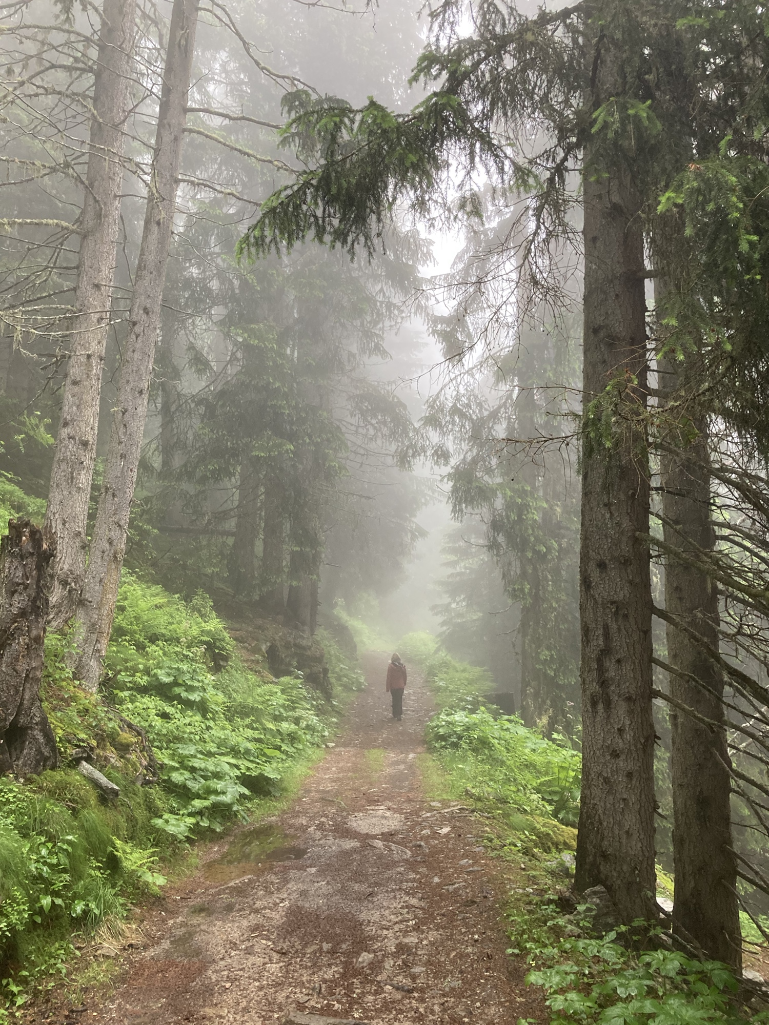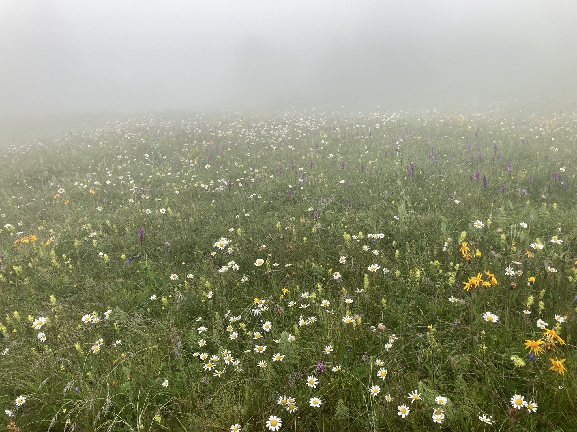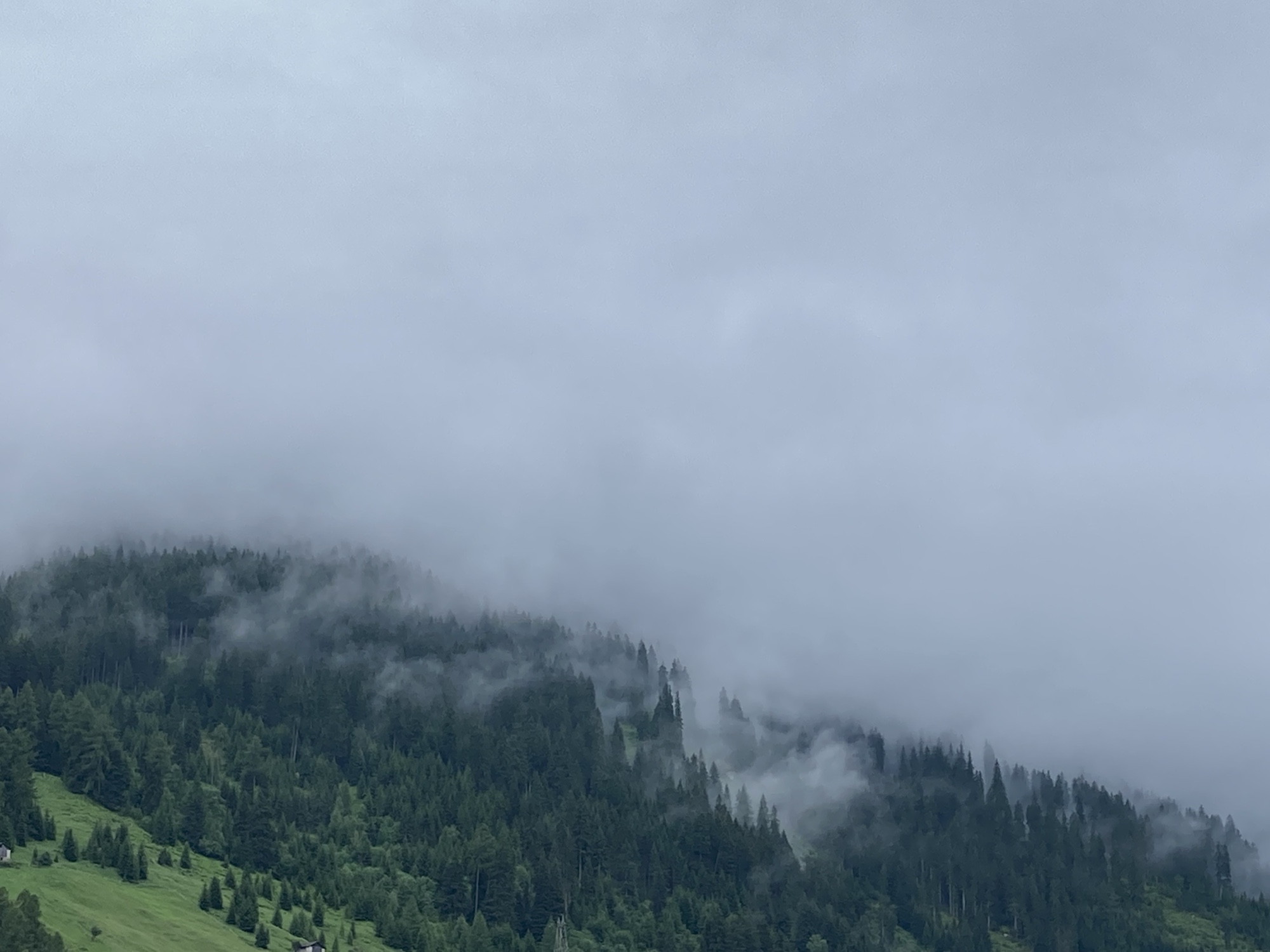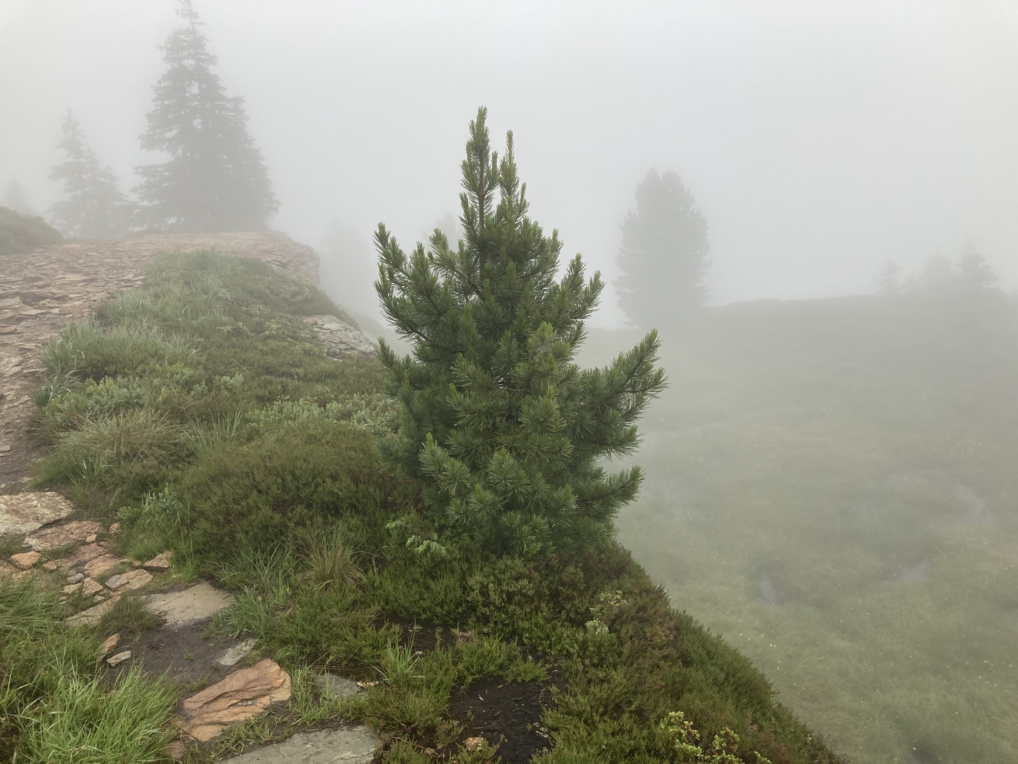 Der zweite Tag kündigt sich noch feuchter an als der Abend des ersten Tags, und wir beschliessen zuerst mit dem Postauto durch den Nebel bis zum Stausee vorzustossen, um anschliessend auf dem Höhenweg von der Frunt durchs wunderschöne, mystische Hochmoor zur Gadastatt zu laufen. Dort nehmen wir die Gondel runter und verziehen uns ruckzuck ins warme Valser Thermalbad. Architektonisch kühn das ganze, auch dessen Entstehungsgeschichte. Am Folgetag reisen wir schon wieder ab, froh die überquellenden Bäche und Flüsse hinter uns zu lassen…