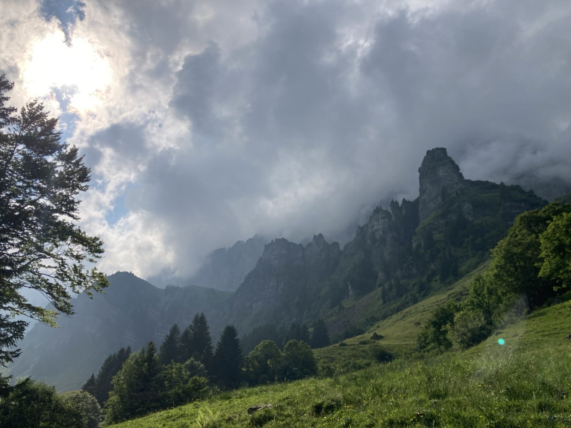 Um die eher touristische Schlaufe hoch nach Braunwald zu umgehen, beschliesse ich direkt über den Bergweg zum Nussbühl-Plateau hochzulaufen. Der nicht enden wollende Aufstieg durch den arg von einem Unwetter gebeutelten Wald verlangt mir alles ab, sodass ich im Nussbühl-Beizli einkehren und mich mit einem Eiskaffe kühlen und stärken muss. Von da führt der Weg abwechslungsreich durch den Wald, bis plötzlich rechts oberhalb der Oberstock und die Jägerstockkette auftaucht, mir bleibt die Spucke weg!