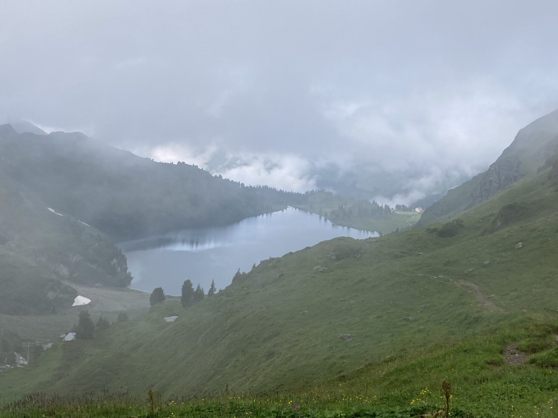 Zuerst gemächlich dann eimmer steiler und zum Schluss ganz und gar im Nebel laufe ich hoch zur Tannalp (wo eine Herrschar einem Outdoor-Gottesdienst beiwohnt), weiter zum künstlichen See mit seinen vielen Fischern, dann durch eine Moorlandschaft und schliesslich hoch zum Gipfelkreuz. Wie bestellt scheint die Sonne und ich kann kurz einen Blick auf Melchsee-Frutt erhaschen, in knapp zehn Tagen werde ich mit Bea dort unseren Hochzeitstag feiern.