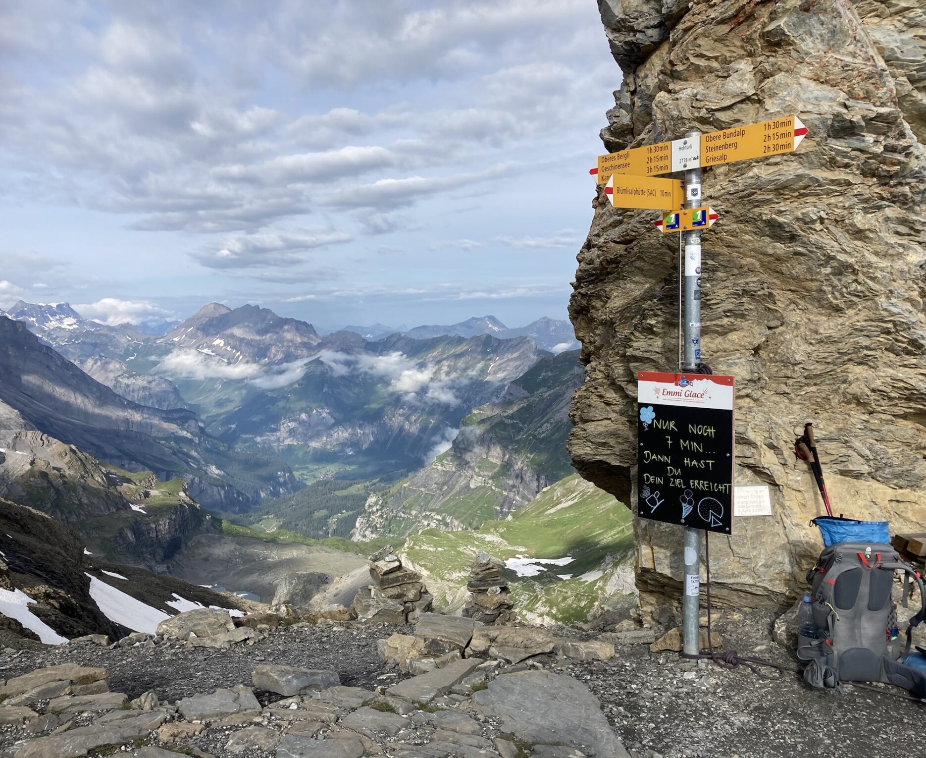 Danach beginnt die Touri-Autobahn, welche ich schon kenne, nichtdestotrotz bin ich von gewissen Felsformationen und des türkisblauen Wassers fasziniert und knipse viele Fotos. Da ich den Wanderweg runter nach Kandersteg schon kenne und um es mit Höhenmetern runter nicht übertreiben zu wollen, gönne ich mir die Talfahrt mit dem Gondeli. In Kandersteg geht‘s über den Ogi-Weg direkt zum nächsten Volg für den Resupply und eine kleine Energiespritze, die ich vor dem Bahnhof genüsslich vertilge. Der Blick zurück sagt mir, beachtliche Leistung, es tauchen aber auch Wolken in der entgegengesetzten Richtung auf… puuuh, länger ausruhen liegt nicht drin!