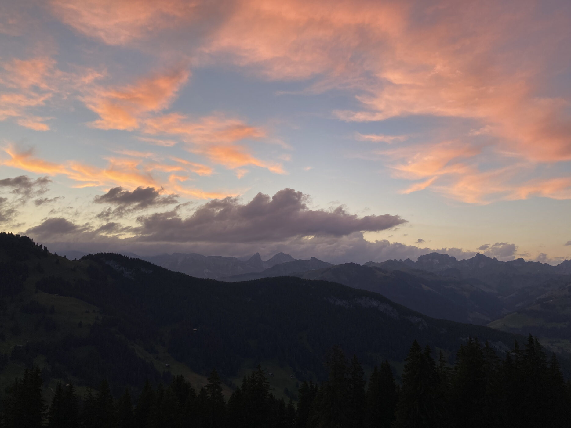 Nun geht es auf der gegenüberliegenden Talseite gleich wieder steil hoch aufs Eggli, wo man im Winter skifahren kann, doch im Sommer für mich komplett unverständlich, nicht rauffahren kann. Ein Trailrunner gibt mir noch den Tipp, zuoberst beim Skilift zu übernachten, denn das Restaurant bei der Bergstation der Gondelbahn werde renoviert. Um nicht allzuviel Wasser den Berg hochschleppen zu müssen, hoffe ich auf der Baustelle fündig zu werden um das kühle Nass für die Nacht nachfüllen zu können. Was ich oben vorfinde übertrifft alle Erwartungen, das neue WC-Häuschen ist bereits renoviert und steht für die Bauarbeiter zur Verfügung… und auch für freche Wanderer. Noch sind es ein paar hundert Meter zum Sessellift, und nachdem ich bei der Bäuerin nachgefragt habe, ob ich beim Rossfälli zuoberst mein Zelt aufschlagen darf, richte ich mein Nachtlager ein. Eine wunderschöne Aussicht hier oben!