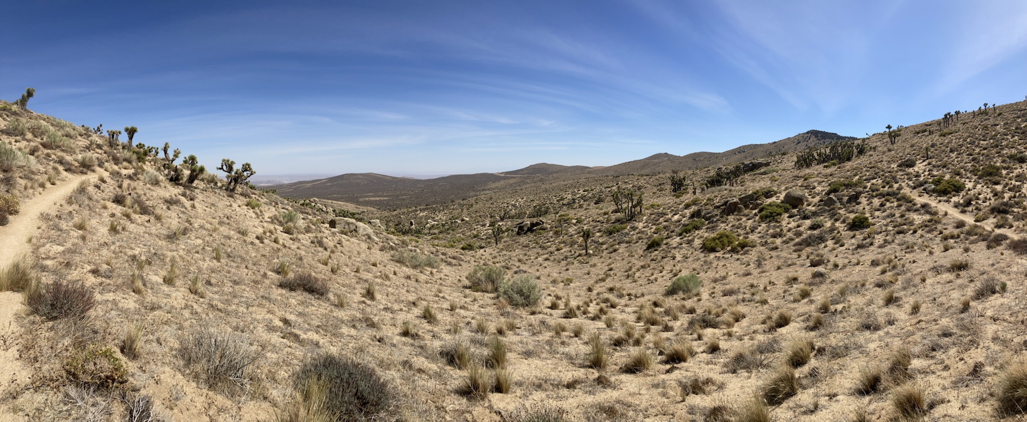 Es folgt ein brutaler letzter Aufstieg, nicht extrem steil jedoch komplett in Sand. Stellt euch den Gang auf dem Sandstrand vor mit rund 16kg auf dem Rücken und das während 4km hoch. Die Fußsohlen schreien, die Knie ächzen und die Waden rufen um Erbarmen, eine echte Kakofonie! 😖 Die Aussicht ist sehenswert und wenig später sehe ich den Trail sich im Nordhang von Wyley‘s Knob dem Pass zudrehen, da werde ich übernachten. Als ich ankomme sind geschätzte 10 Hiker bereits da, es macht sich Panik breit, denn von den insgesamt rund 600 Liter Wasser im Cache ist gerade mal noch eine Gallone übrig. Ich komme als letzter zum Zug und kriege noch etwas über einen Liter ab (zzgl. meinem Reserveliter, den ich quasi immer als Backup dabei habe), was für die anstehenden morgigen 30km ohne (!) Wasserquelle machbar, aber am Limit ist. Ich denke an die vielen Hiker:innen, die ich am heutigen Tag überholt habe und nach mir eintrudeln werden. Einem Hiker geht es sehr schlecht, kommt komplett dehydriert ins Camp, hat 3 Liter aufs mal getrunken, pinkelt Blut. Diejenigen, die nichts auf sich haben, schmieden bereits Pläne für Alternativrouten, sitzen lethargisch am Boden, heulen, suchen in Gillian’s Pferd und Maultier die Schuldigen (obschon diese über einen eigenen Cache verfügen) oder ziehen gleich weiter. Zu viert organisieren wir schliesslich, dass ein Trail-Angel um halb zehn Nachschub bringt, Glück gehabt. Ich hoffe schwer, dass dies gewissen eine Lehre gewesen ist… im Gebirge werden wir sehen, ob sich das ganze bezüglich Nahrung wiederholen wird. 🤨