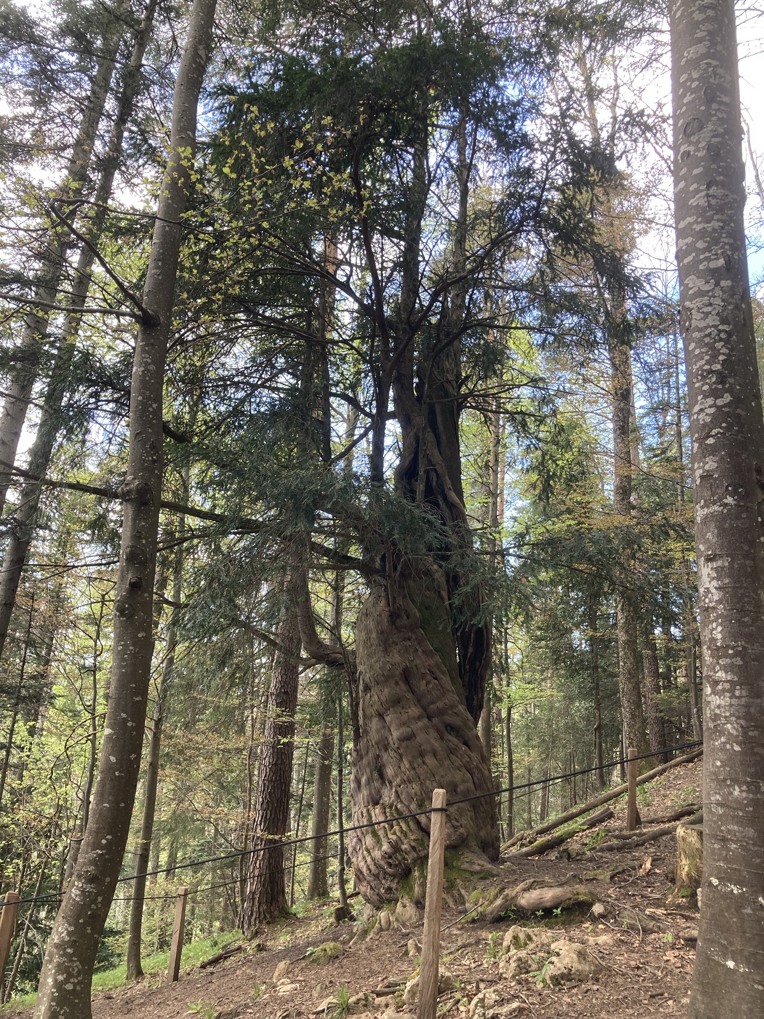 An einem sonnigen Samstag mache ich mich mit Bea auf, die rund 2.5 stündige Wanderung unter die Füsse zu nehmen. Anfahrt bis Crémines-Zoo und dem Erlebnispark ist per Auto oder Zug absolut problemlos, von da weg geht es in ein paar langen Kehren über Felder und dann durch Wald auf Schotterpisten hoch bis zur Lichtung gleich unterhalb der ehrwürdigen Eibe. Zuerst verspeisen wir unser Picknick und lasse eine Wandergruppe von dannen ziehen, gelangen gestärkt und einem kleinen Trampelpfad folgend zur sinnvollerweise abgesperrten Eibe. Staunend stehen wir davor und ich geniesse den Gedanken, dass dieser verdreht-knorrige Baum schon zu Zeiten Napoleons hier stand und über das Tal hin zu Moutier wachte. Muss man erlebt haben, meine Meinung!