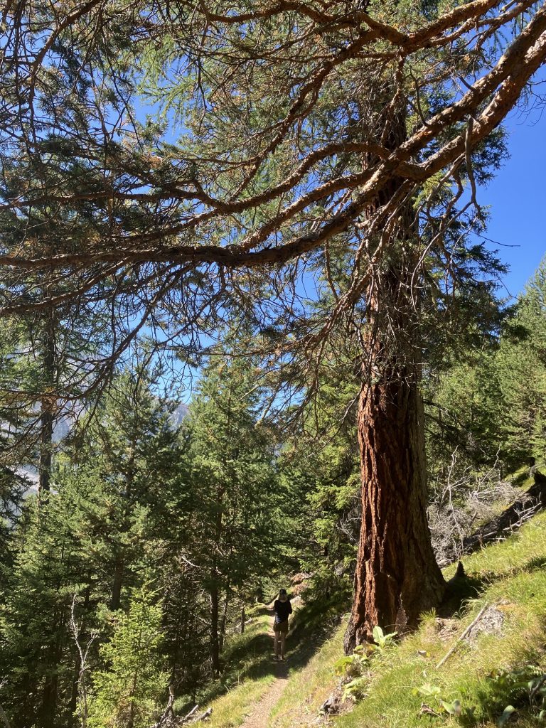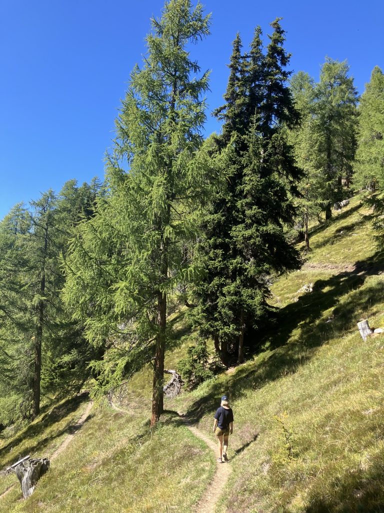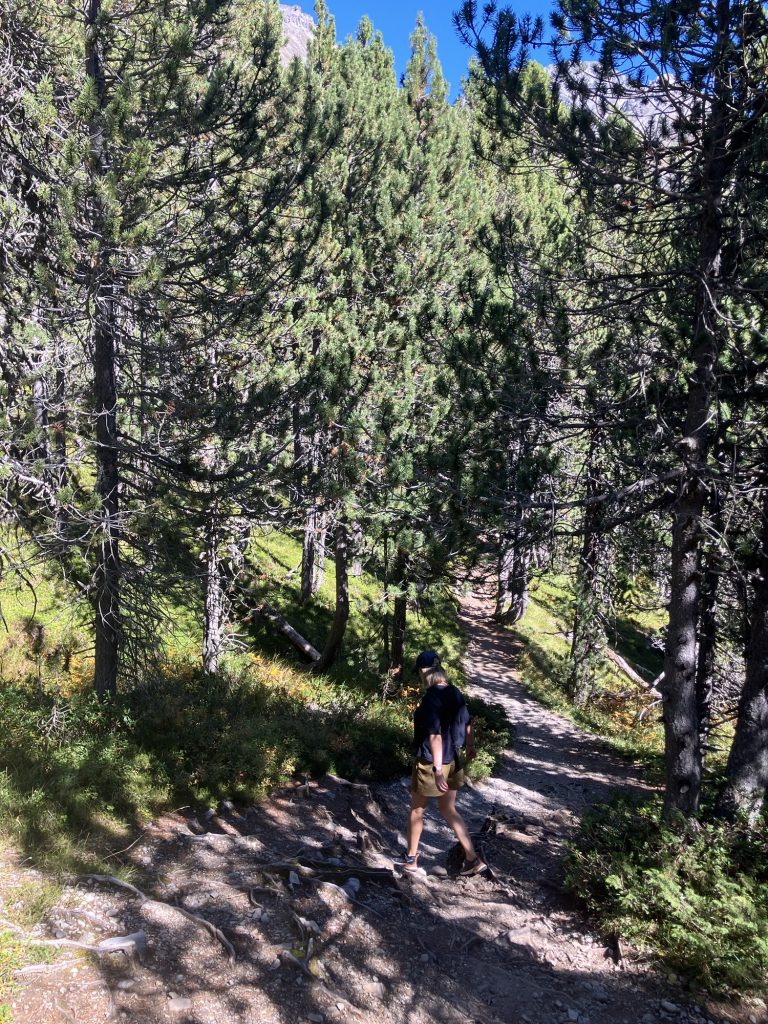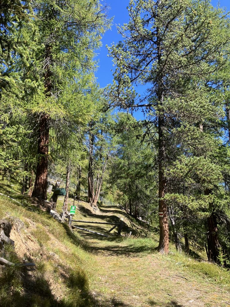 Kurz vor dem Bergsee Lai da Juata biegen wir vom Senda Val Müstair, der bis nach Lü sich weiterziehen würde, talwärts ab. In sehr trockenem und steilem Gelände geht es den Hang nach Tschierv runter, die Höhenmeter machen sich in den Knien bemerkbar…