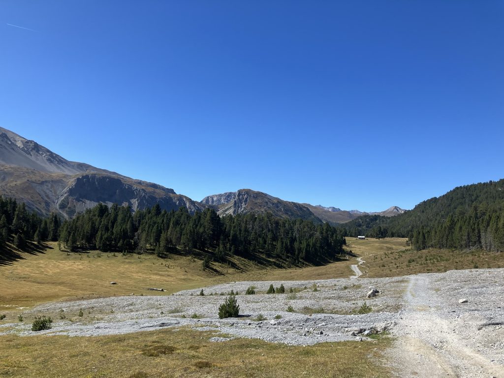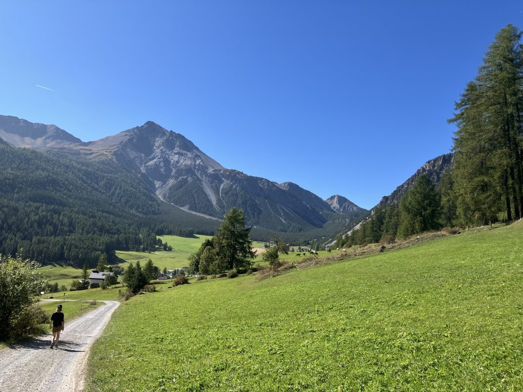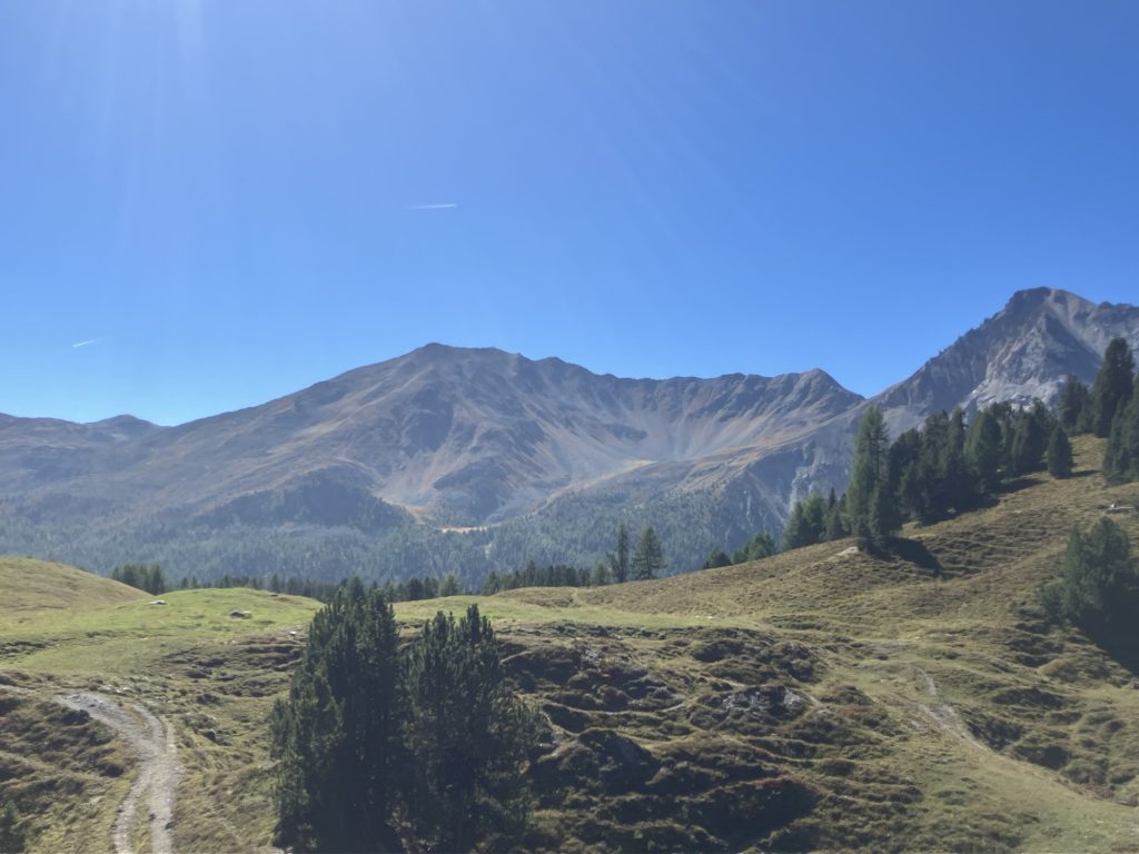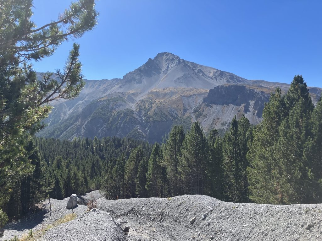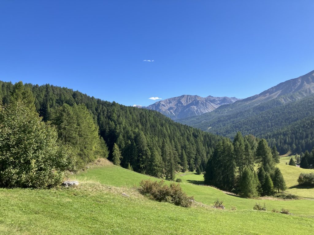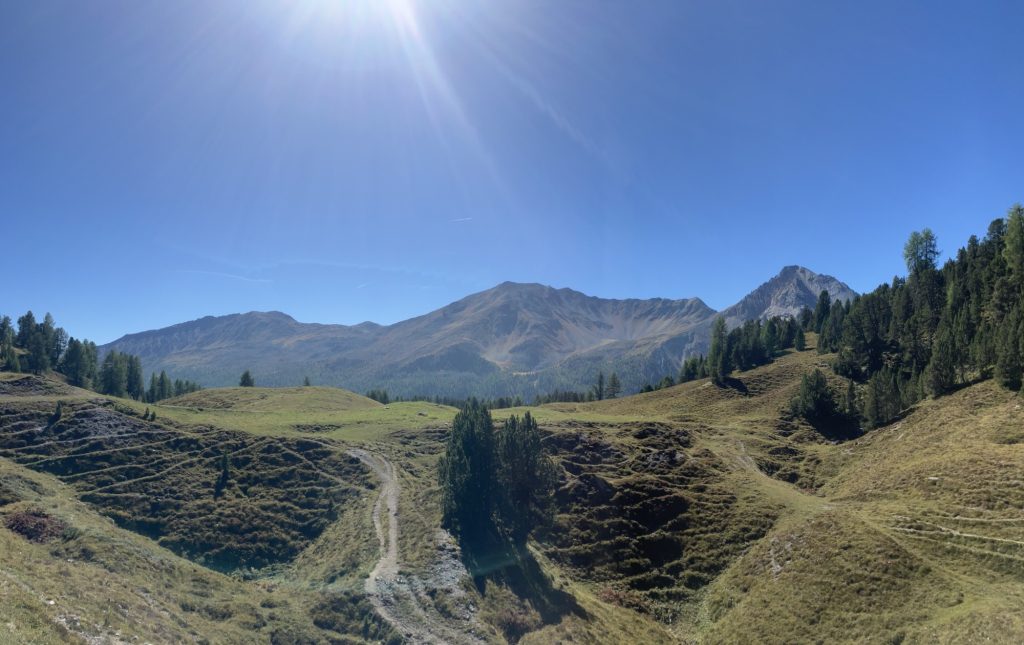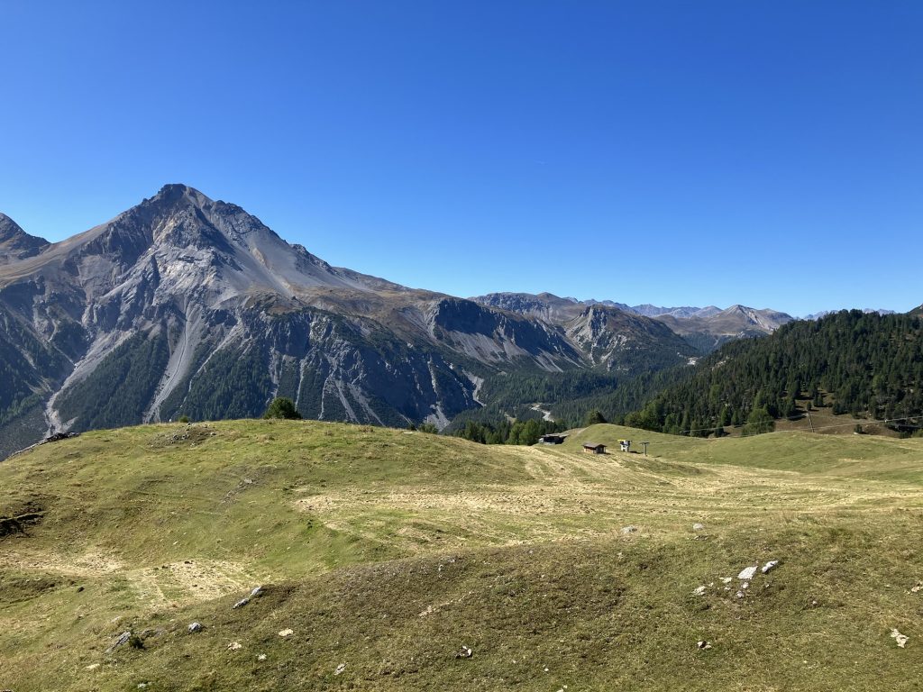 Unsere erste Wanderung führt uns vom Ofenpass auf der nördlichen Talseite des Val Müstair entlang zur Alp da Munt, immerzu den Blick auf das Massiv des Piz Umbrail vor Augen.